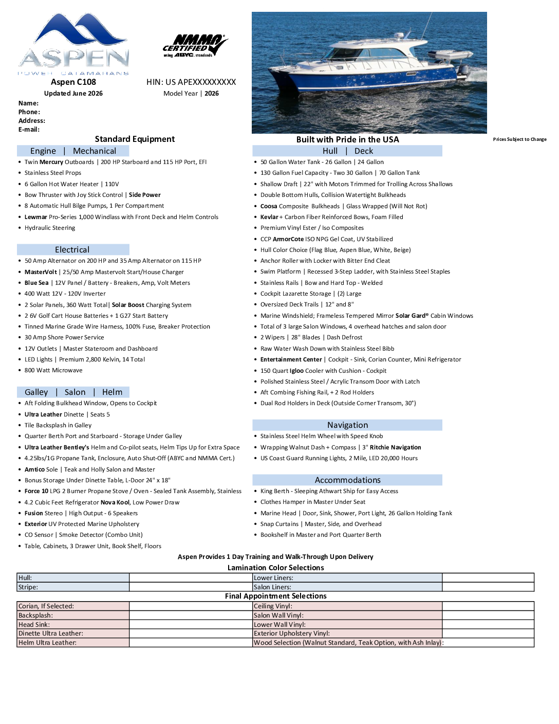 The Aspen C108 expands on the company’s patented hull design featuring both non-symmetrical hulls and power that provide exceptional efficiency, tracking, and performance in all sea conditions.
