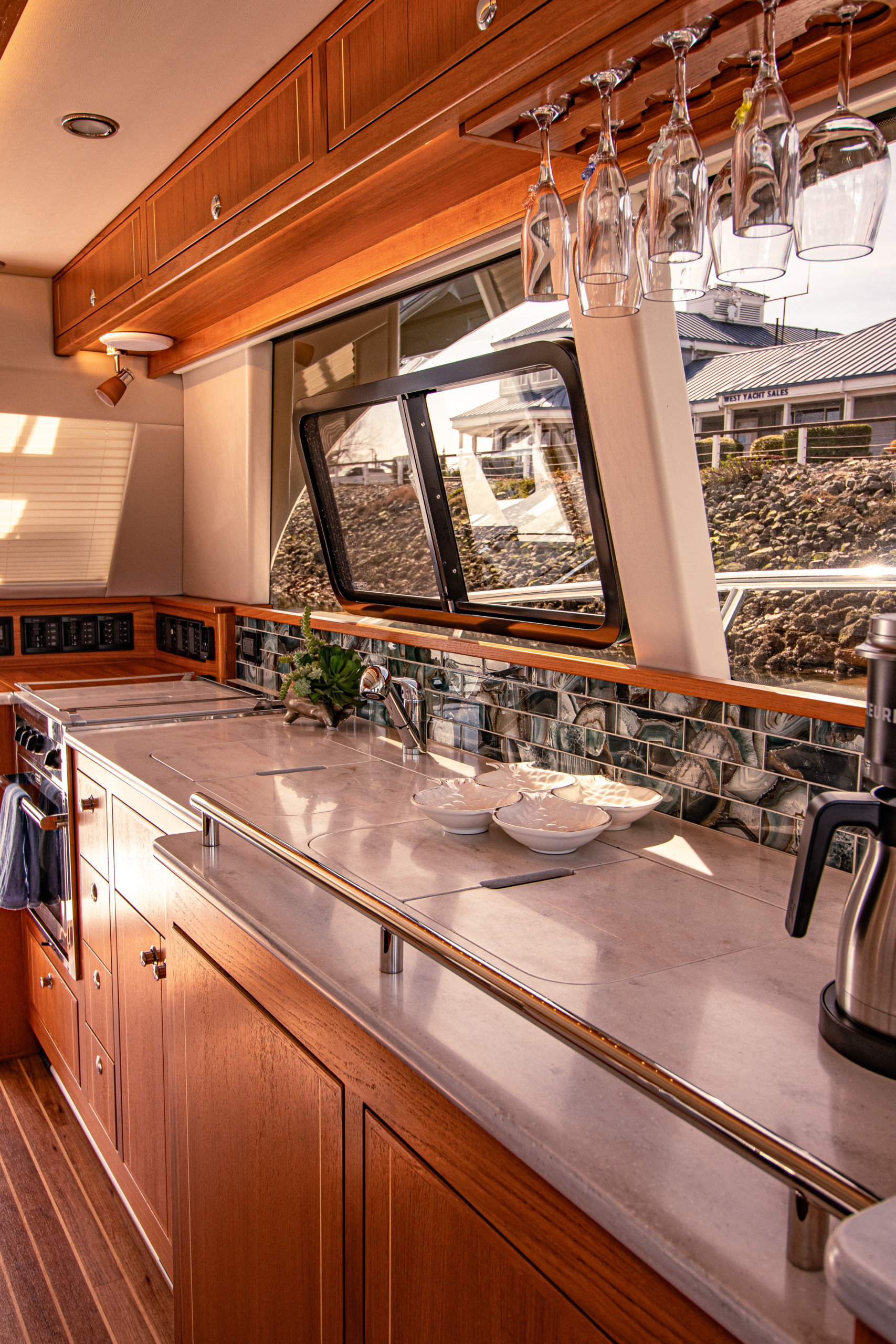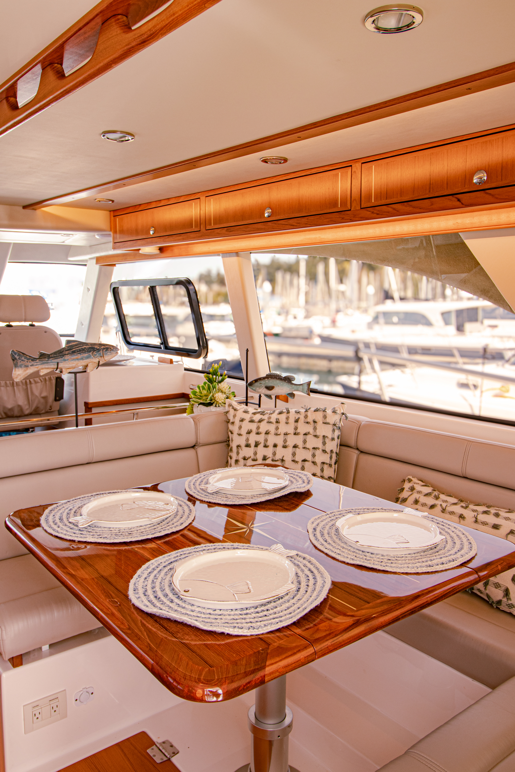 She is fast and maintains Aspen’s signature efficiency, and is also the first boat in the category with 600 square feet of deck and living space. The modern design starts in the salon with an amazing open-window layout that provides 360-degree views from every seat. Forward is the full-width, island king Master stateroom, which includes port and starboard hanging lockers, drawer sets, and starboard vanity. Each hull has a roomy head with a shower and large vanity. Below the dinette is a queen-size VIP guest stateroom, complete with hanging locker and portlights. Below the galley, a second guest stateroom has a twin berth and portlights.