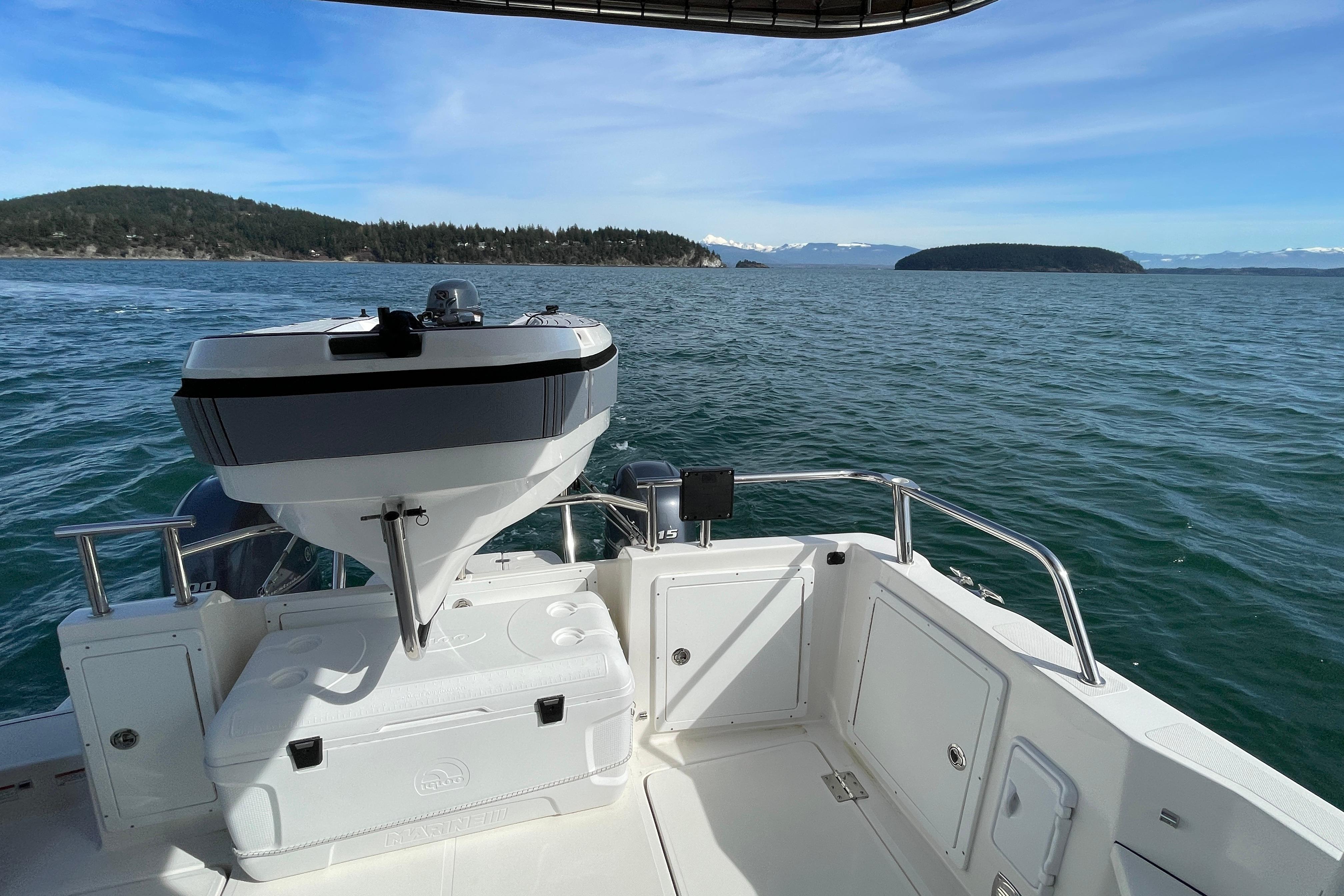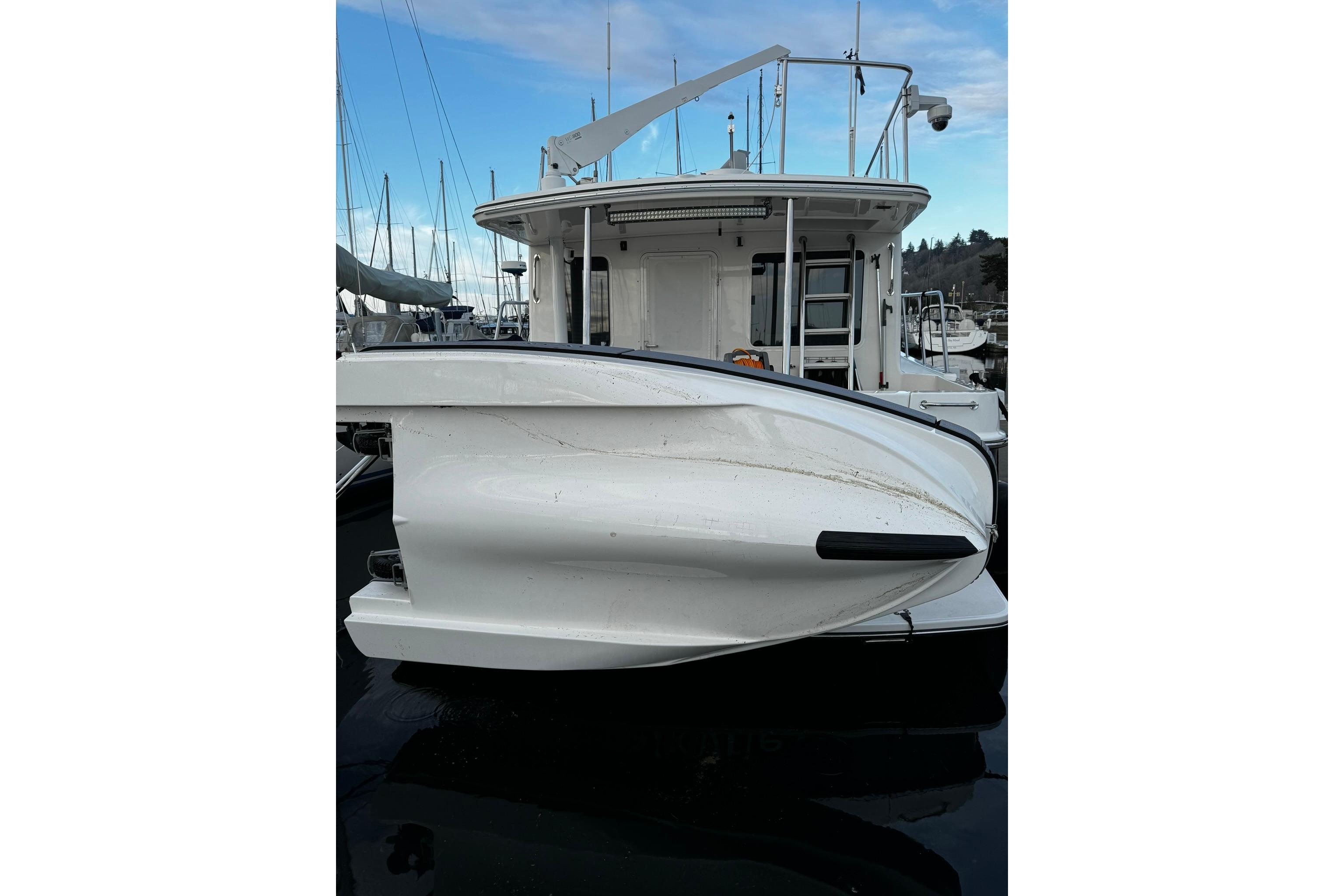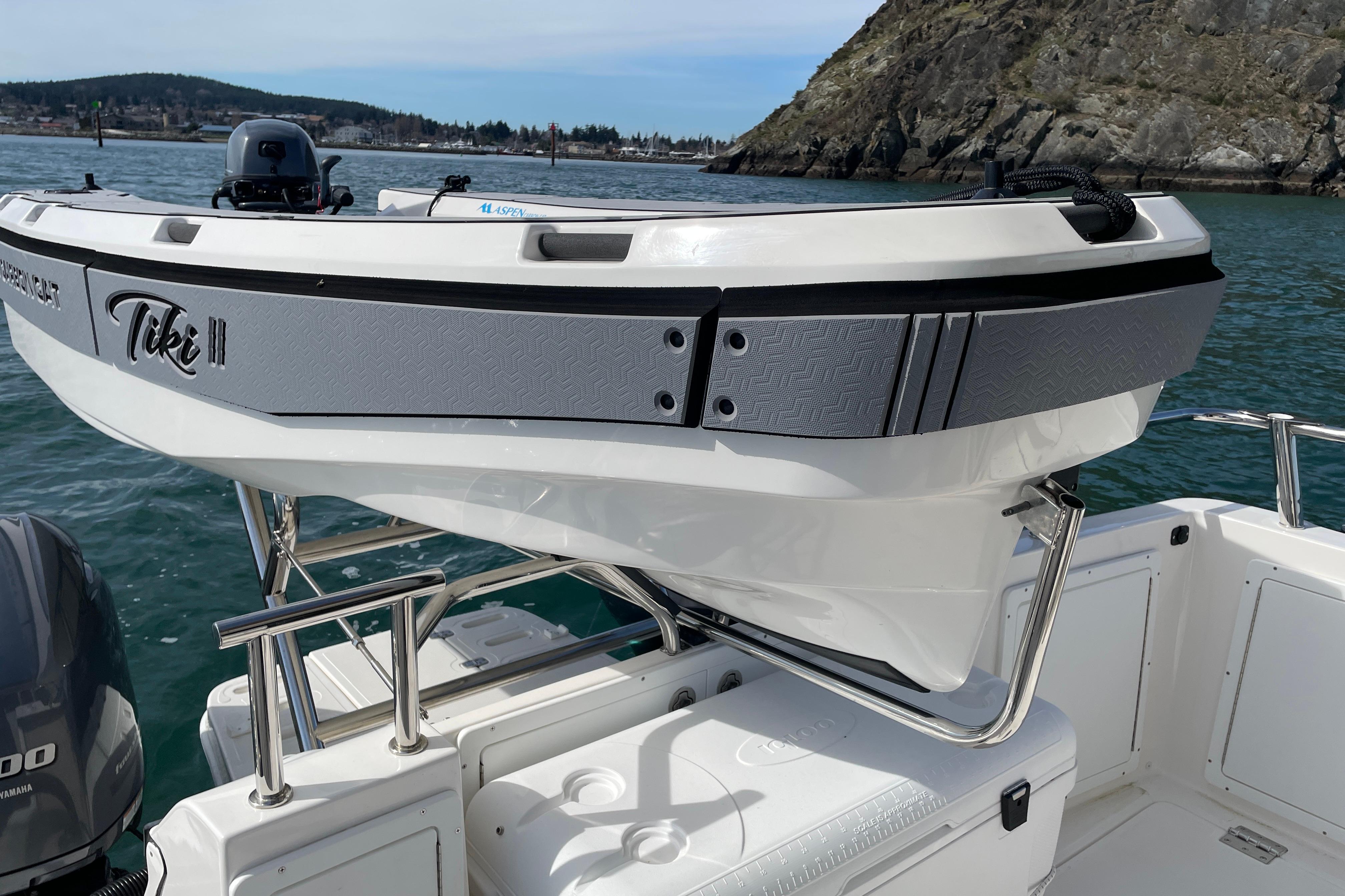 This hybrid design starts with a deep single-entry forefoot that smoothly cleaves through waves for improved tracking and spray resistance. The hull contour then gently widens aft and at the stern resembles a modified catamaran hull which provides lateral stability and lift.