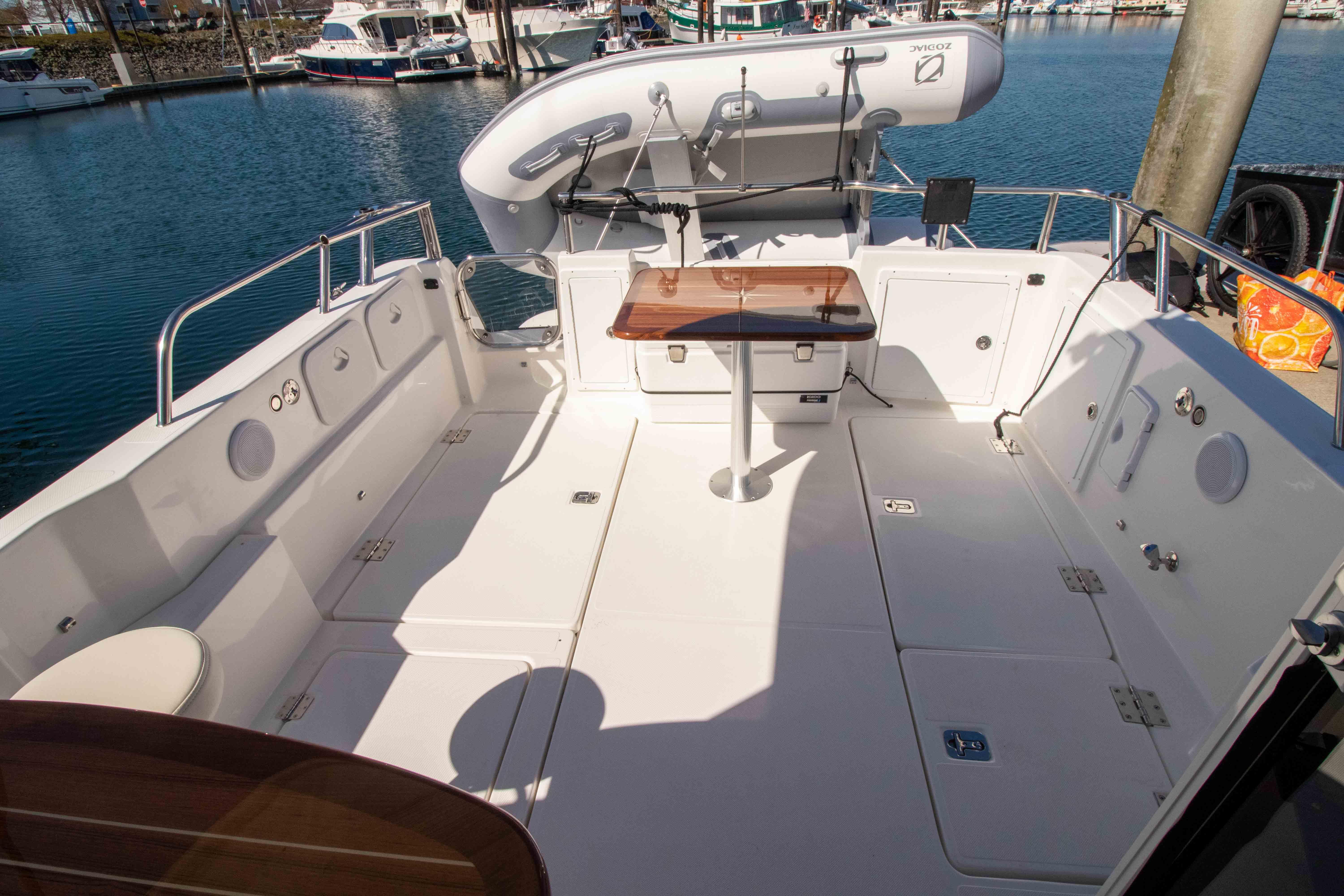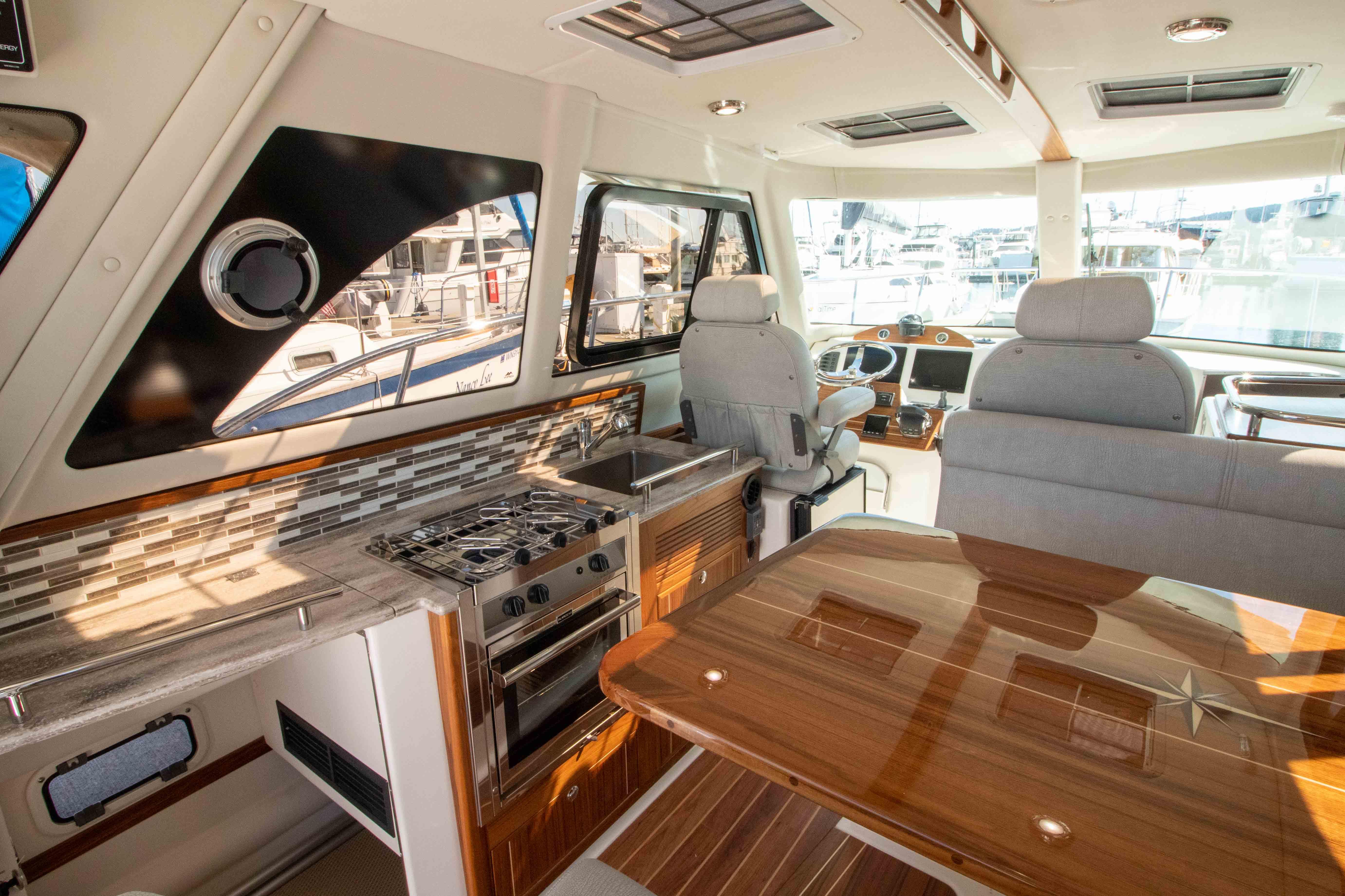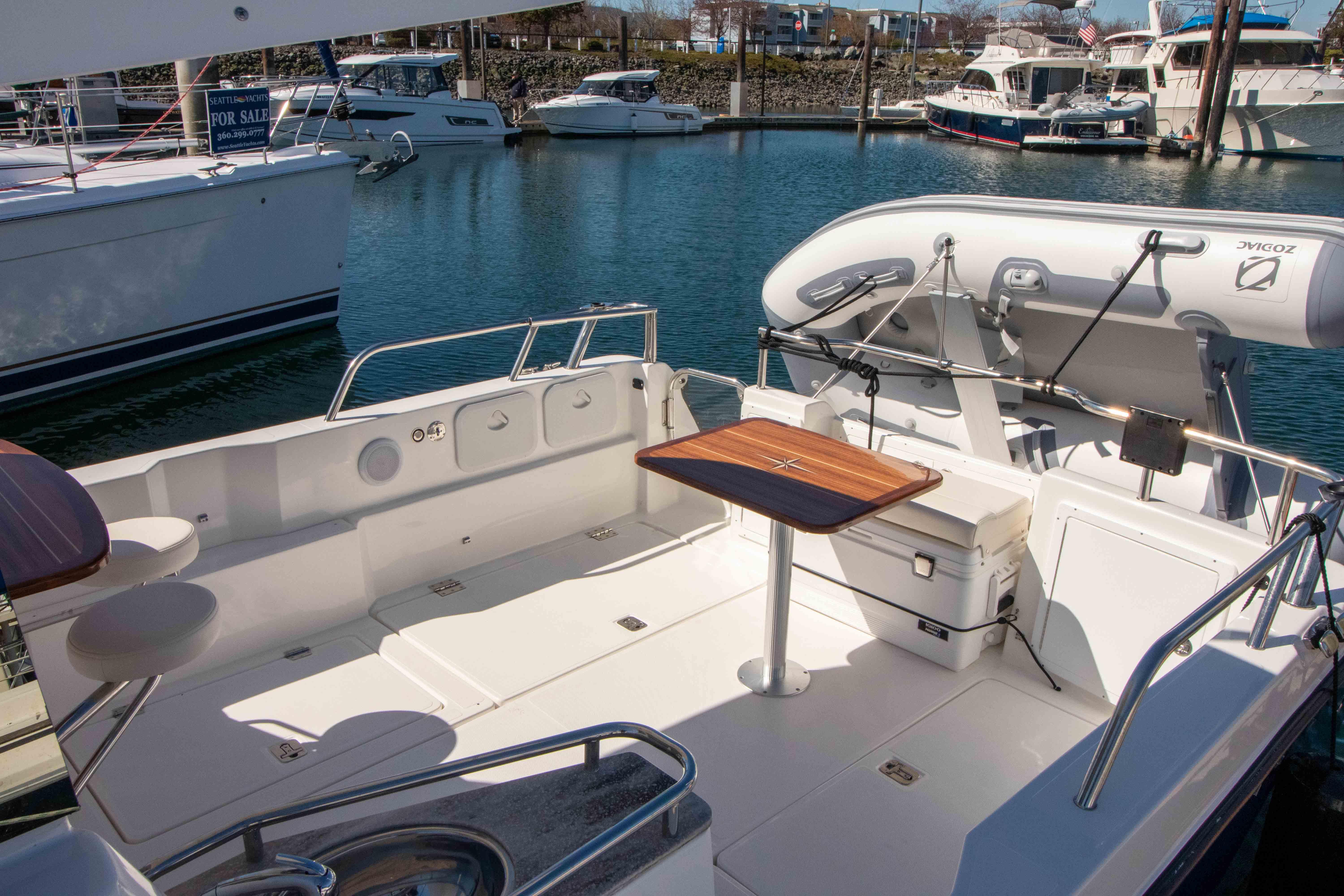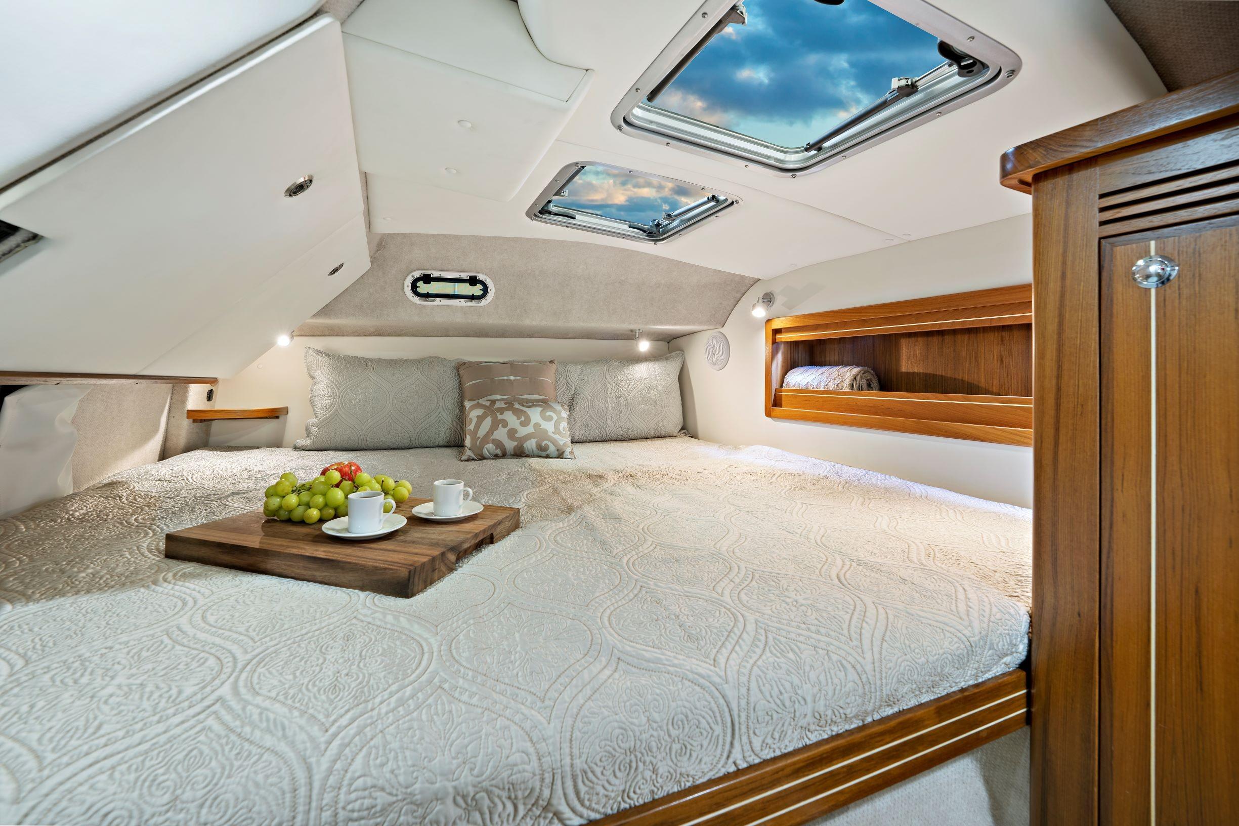 The new 32′ C100 Escape has a similar cabin, salon, and interior components as our C90 Cruiser, but the hull and deck are 4′ longer in the cockpit ideal for fishing and entertaining, this area also includes several standard features that are not available in the C90. It has a built-in 96 qt. Igloo Cooler with a large seat, huge port and starboard lazarette storage, as well as a 2nd refrigerator and sink. The Volvo D3 220 hp is mounted just aft of the salon bulkhead which reduces noise levels. This, combined with over the top use of premium sound deadening, makes the C100 exceptionally quiet underway. Engine access is via a 2′ x 4′ day hatch, as well as a huge 4′ x 6′ removable deck section.