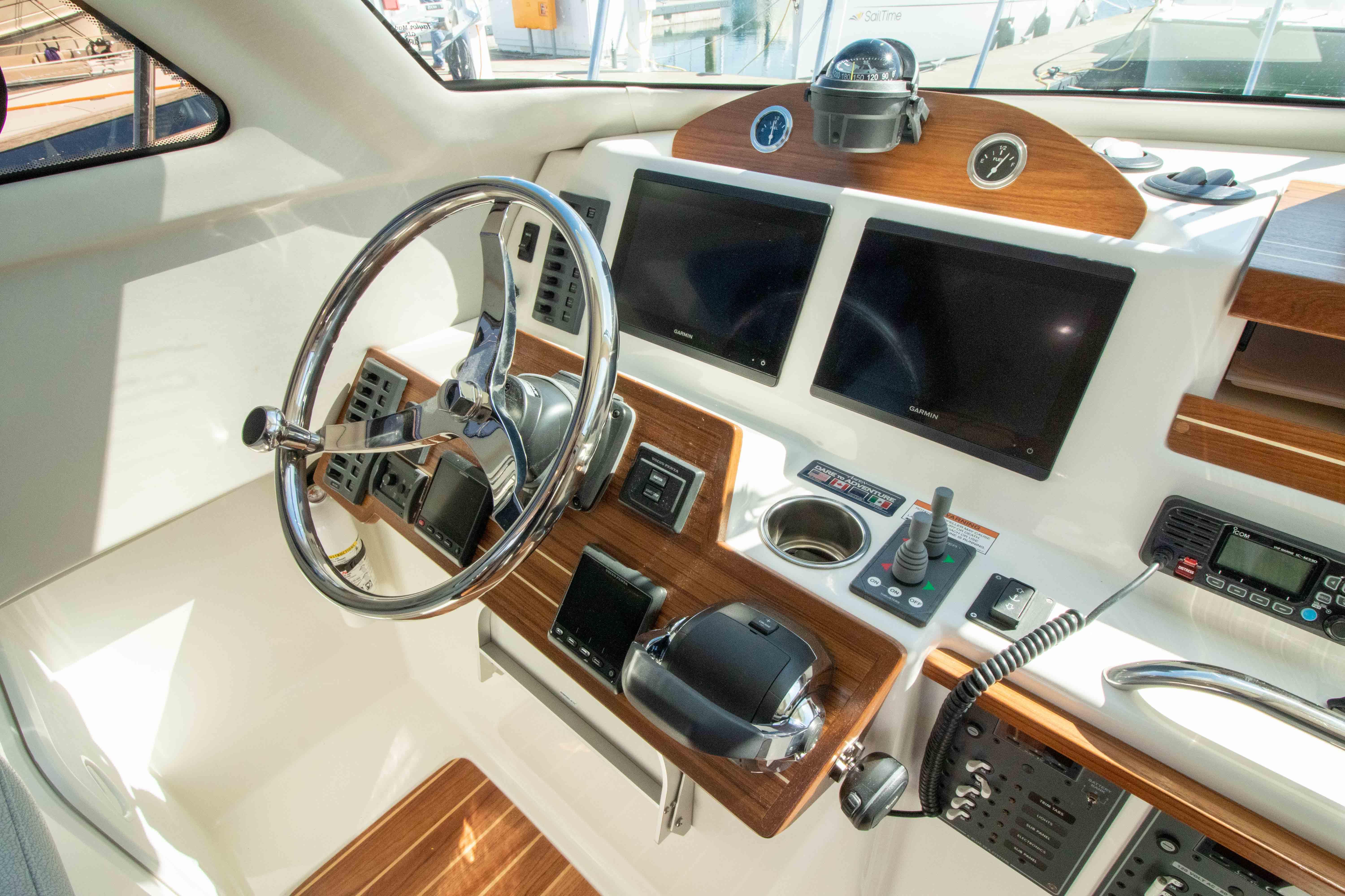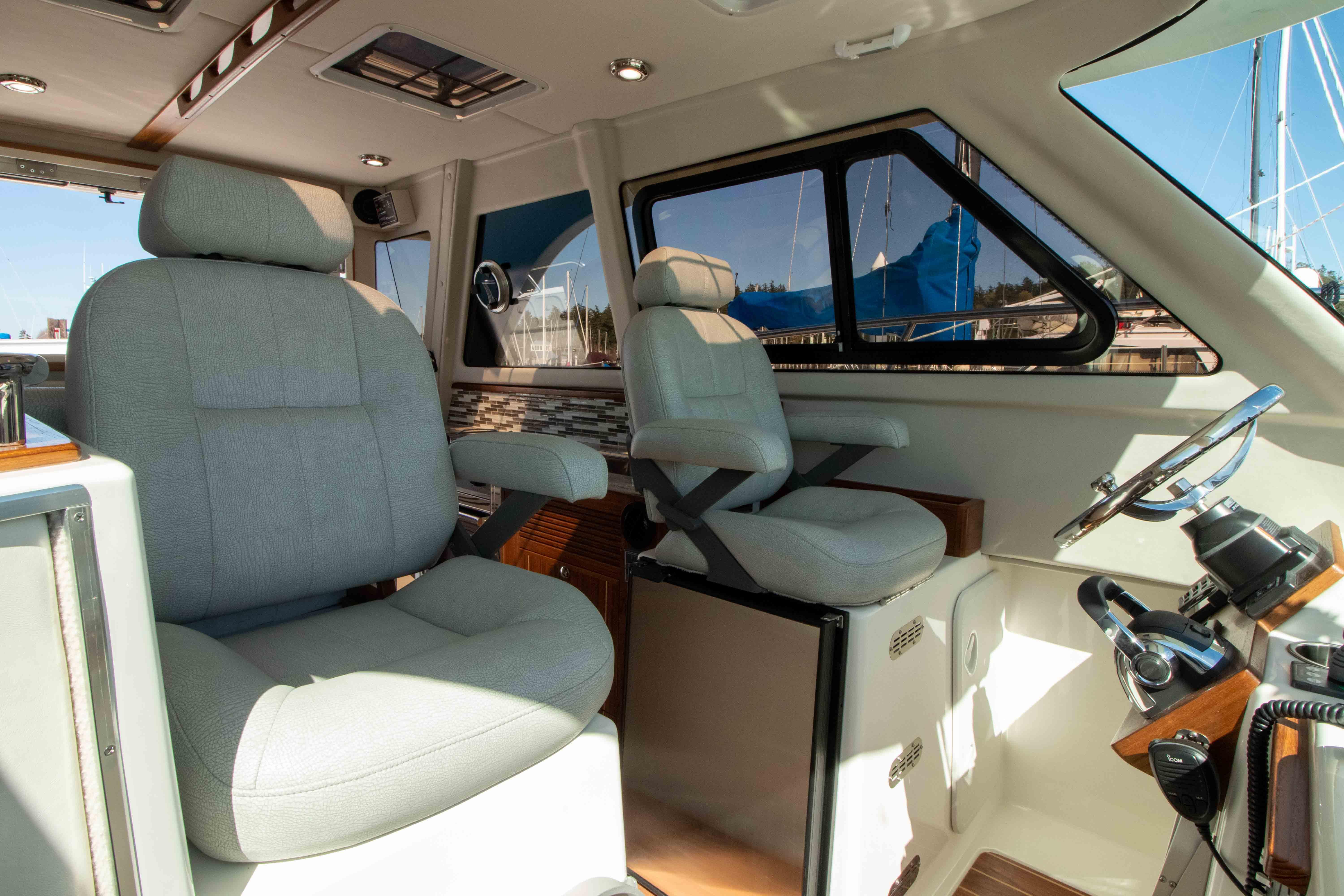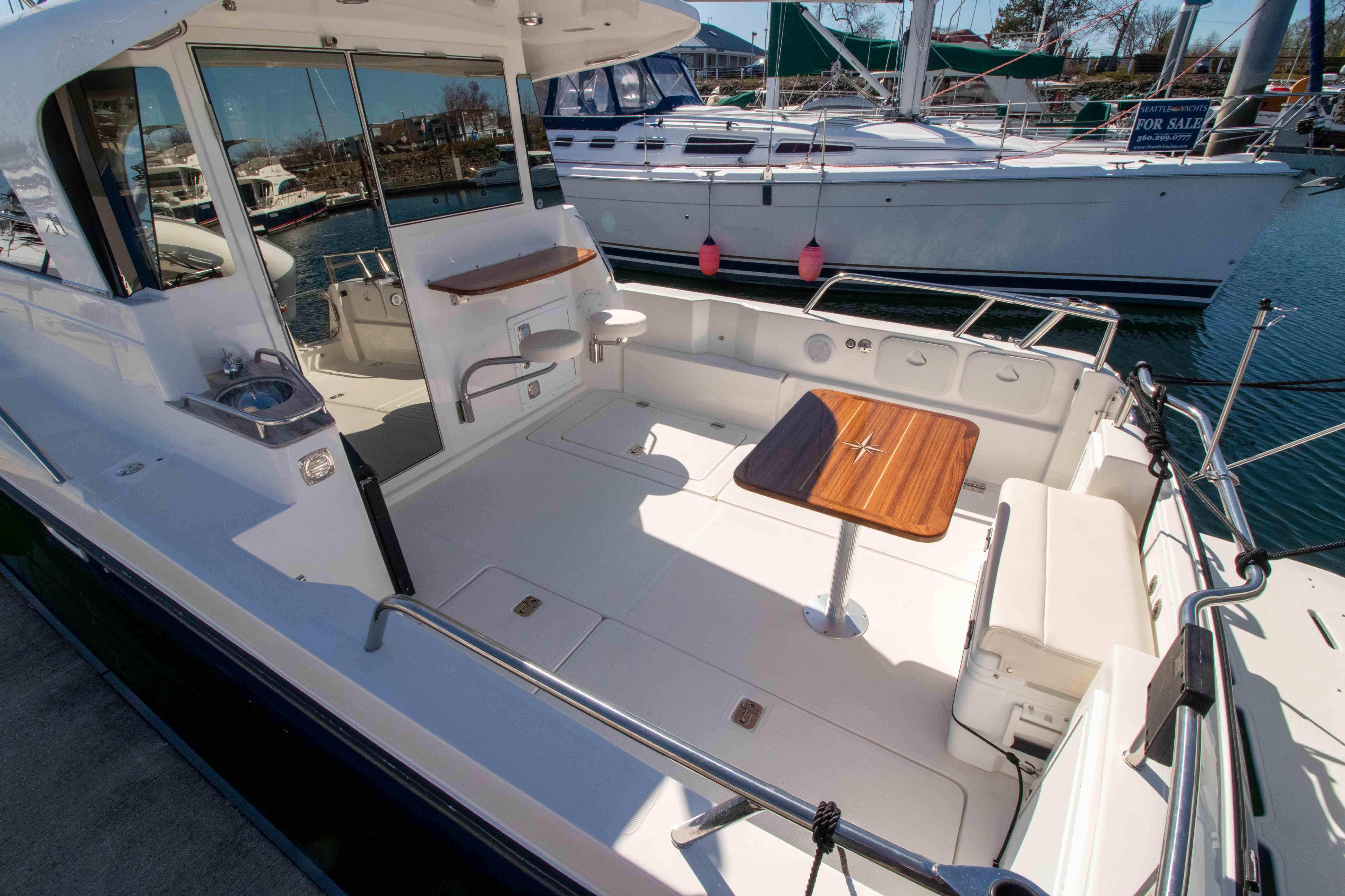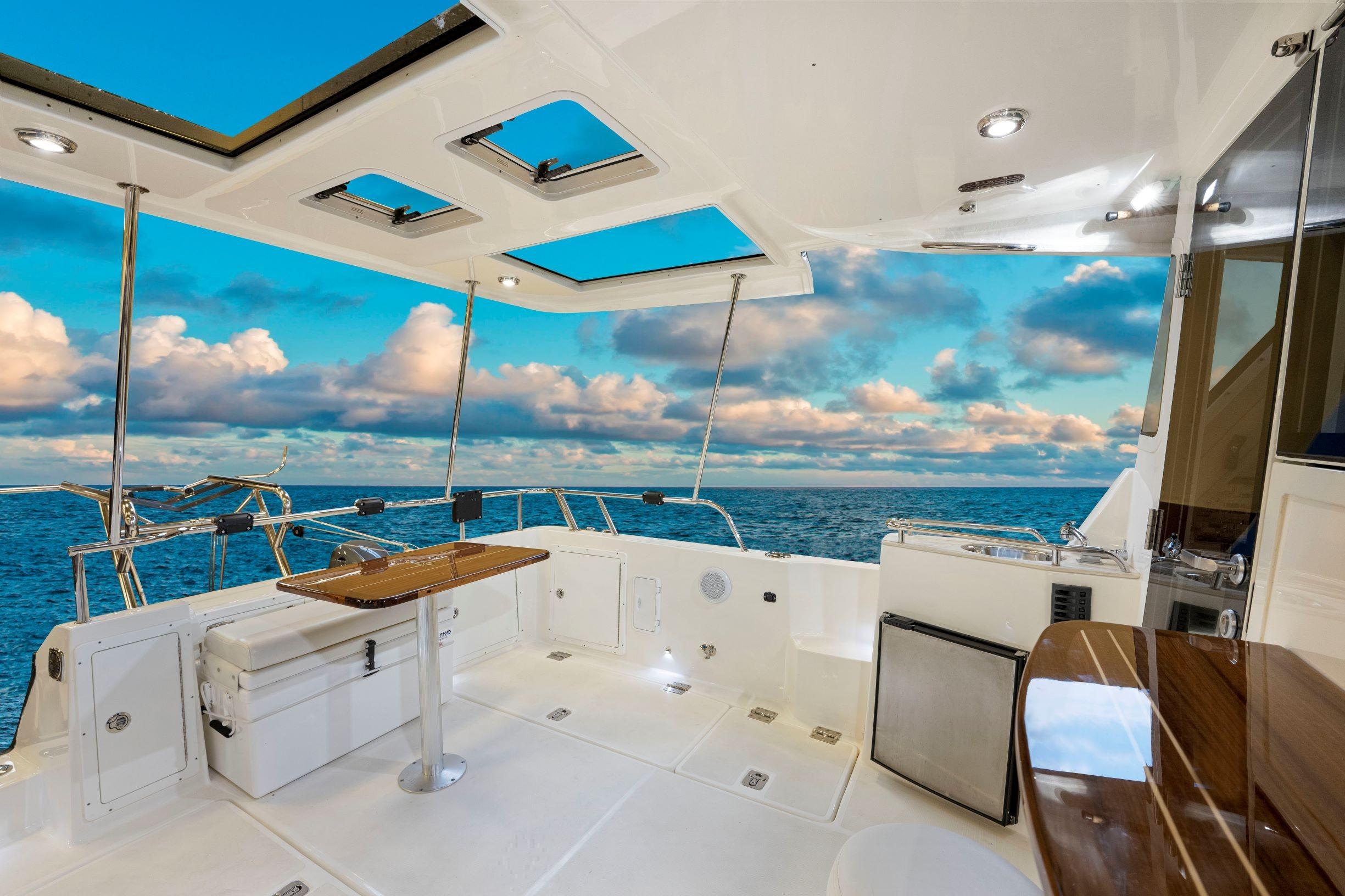 The new 32′ C100 Escape has a similar cabin, salon, and interior components as our C90 Cruiser, but the hull and deck are 4′ longer in the cockpit ideal for fishing and entertaining, this area also includes several standard features that are not available in the C90. It has a built-in 96 qt. Igloo Cooler with a large seat, huge port and starboard lazarette storage, as well as a 2nd refrigerator and sink. The Volvo D3 220 hp is mounted just aft of the salon bulkhead which reduces noise levels. This, combined with over the top use of premium sound deadening, makes the C100 exceptionally quiet underway. Engine access is via a 2′ x 4′ day hatch, as well as a huge 4′ x 6′ removable deck section.