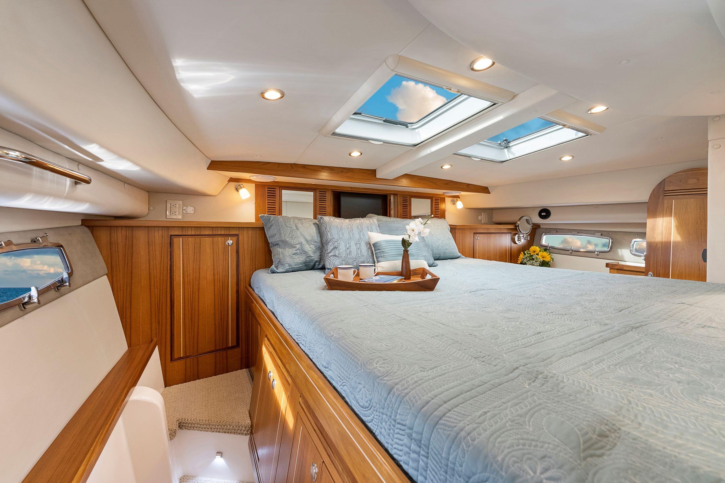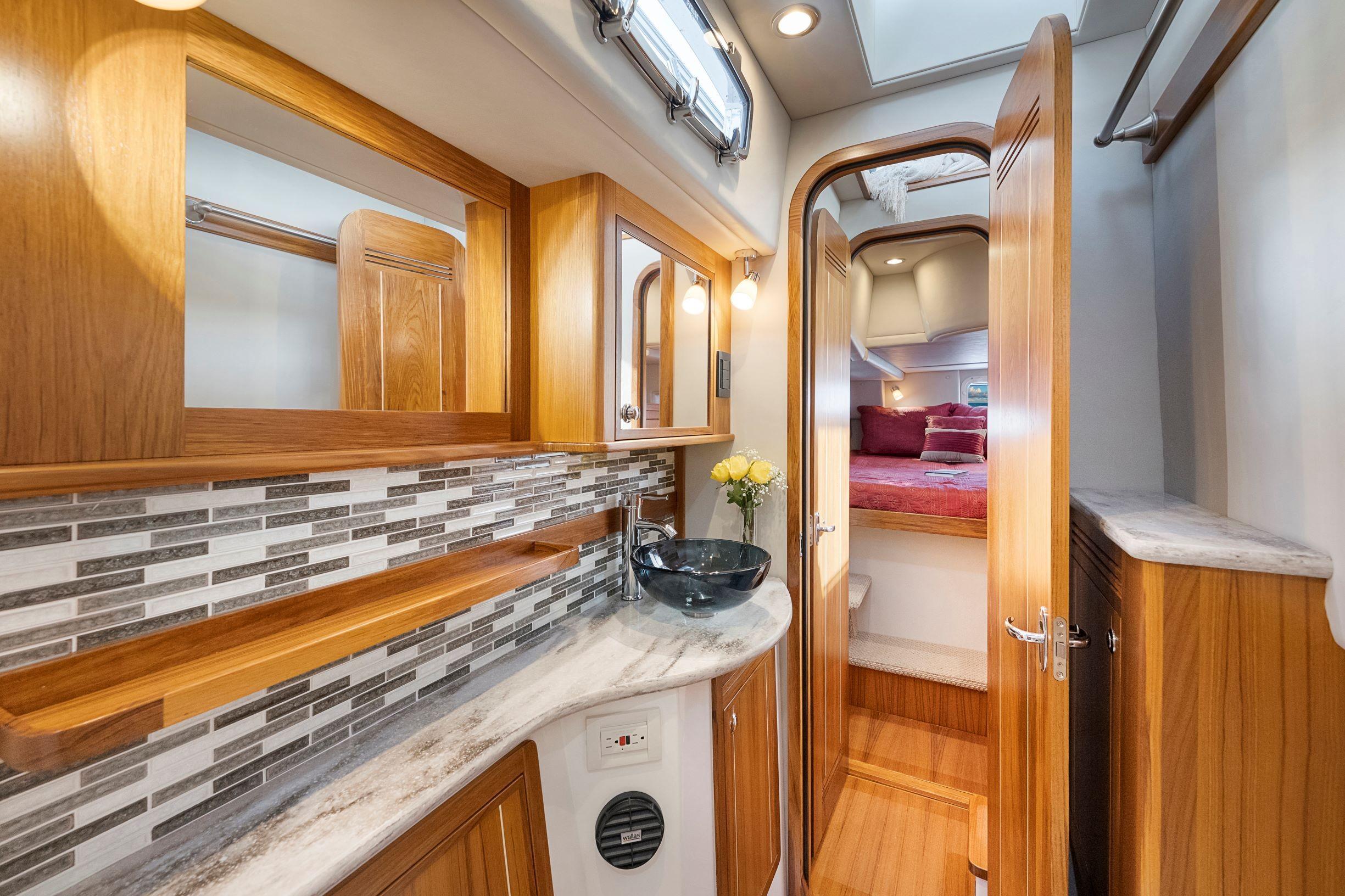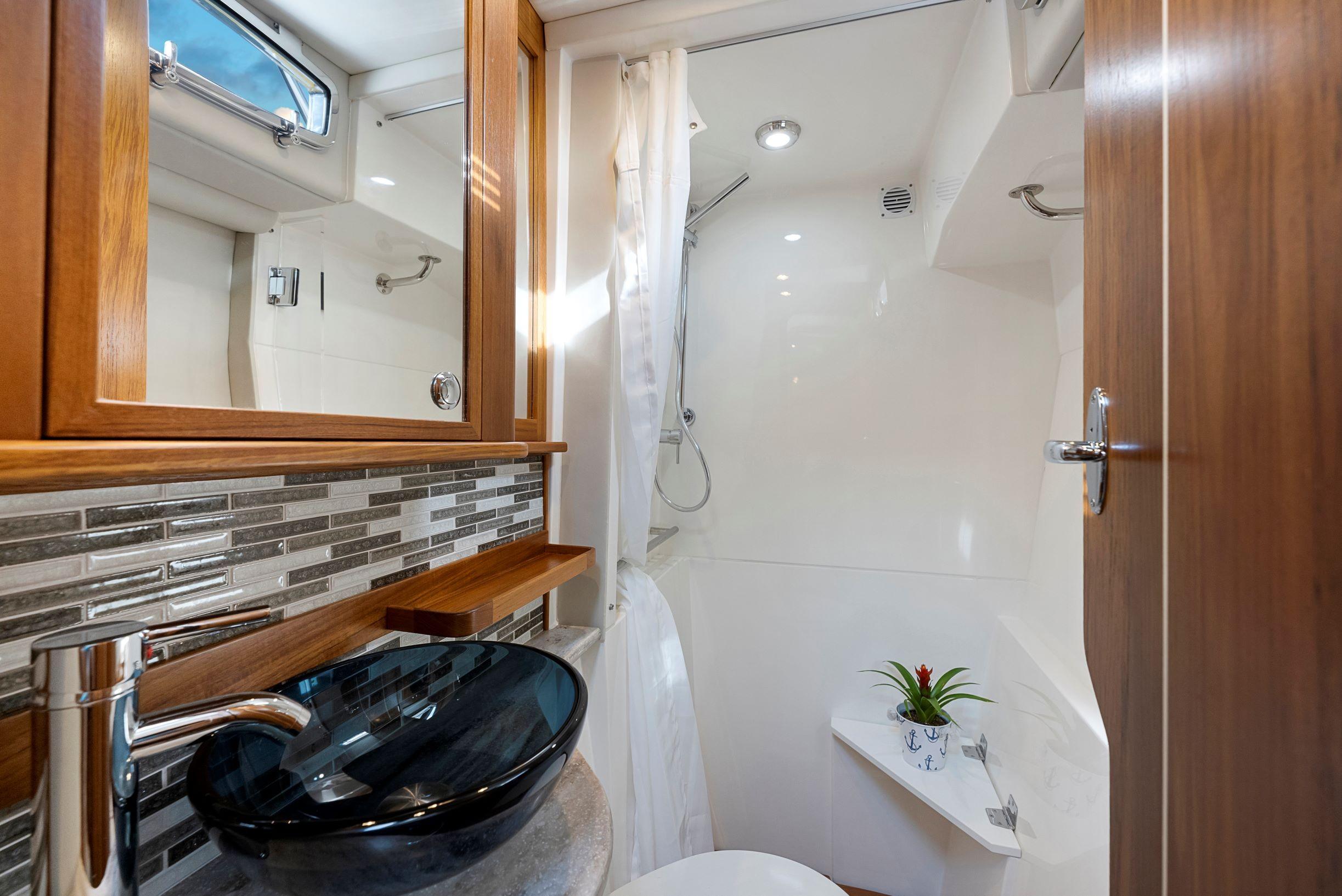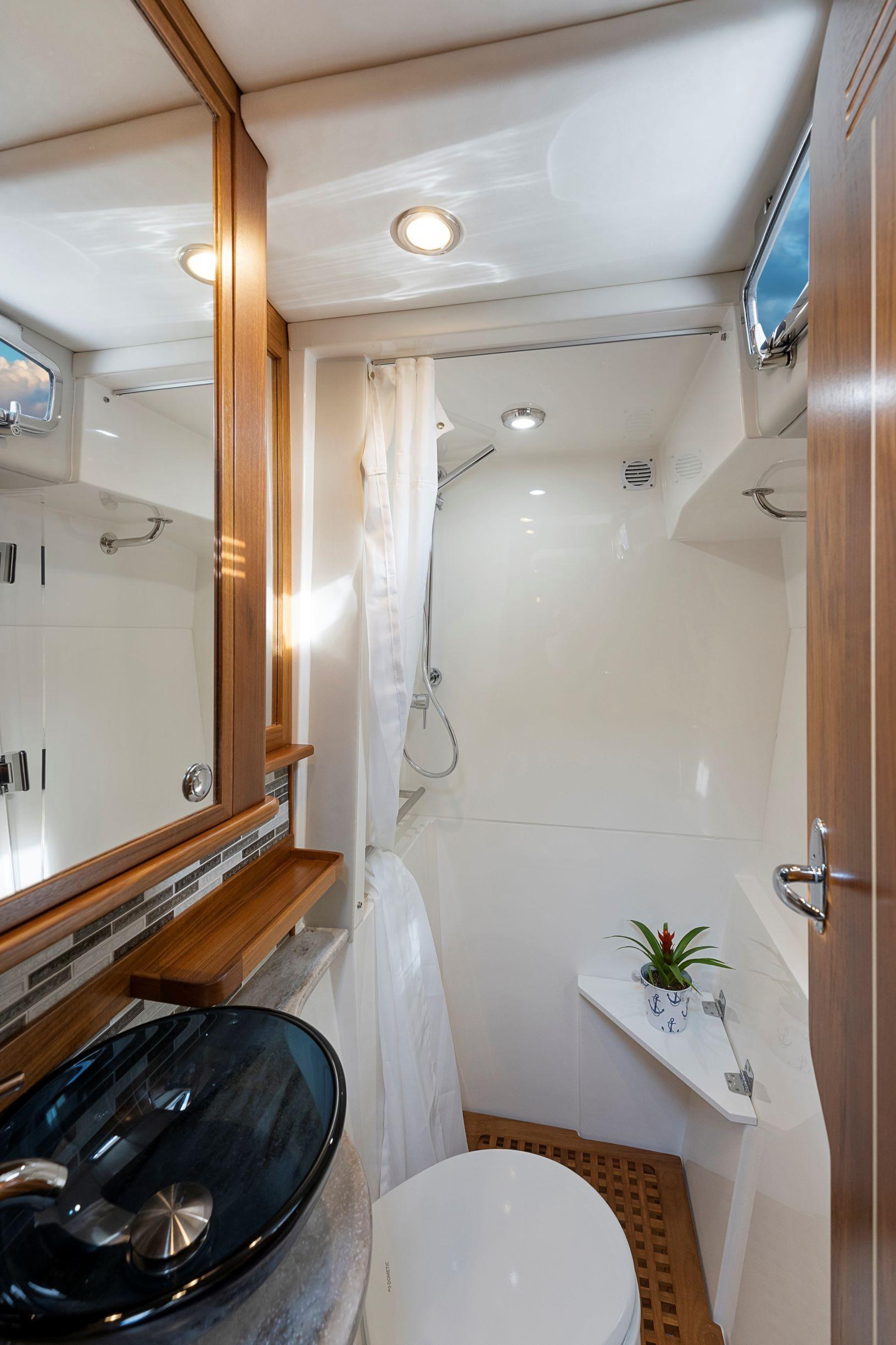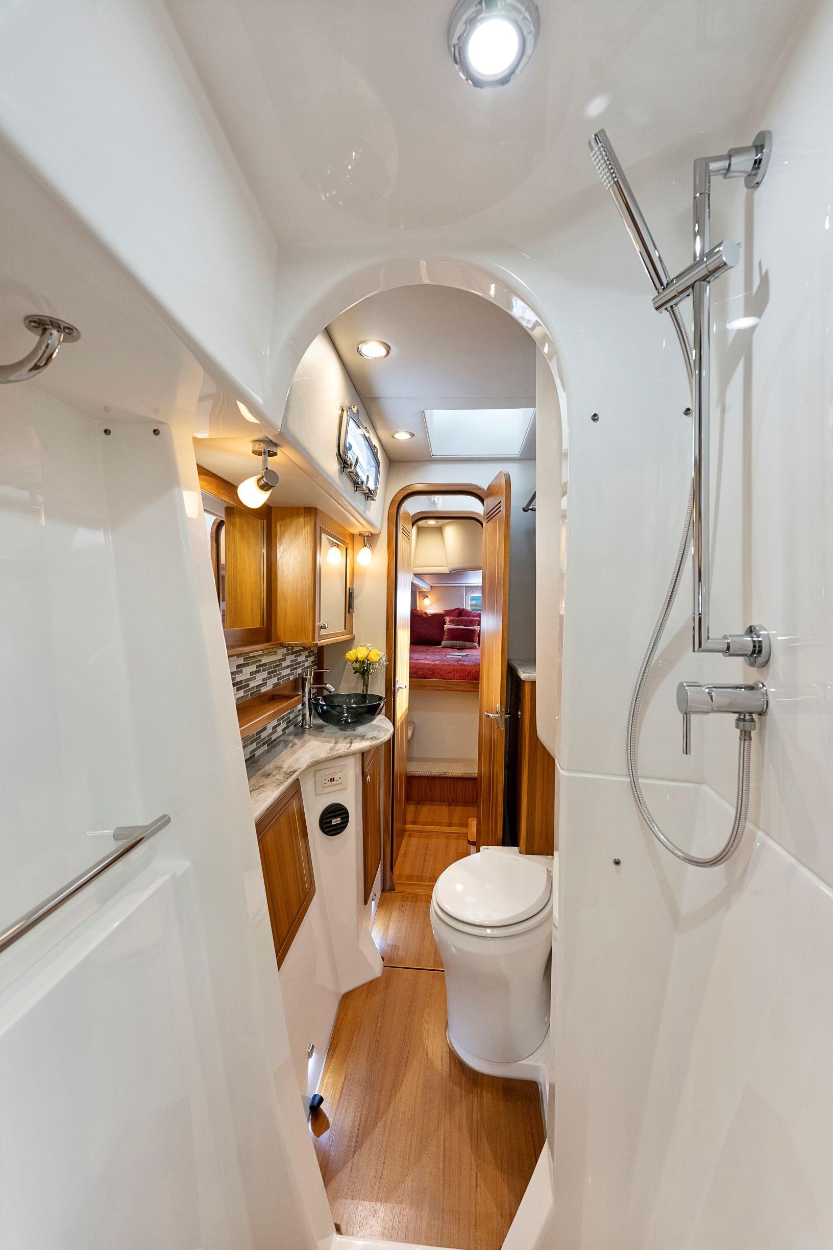 The modern design starts in the salon with an amazing open window layout that brings the grand outdoors right to you. Enjoy Mother Nature in all of her glory with a 360 degree view from every seat! Each hull has a first class head with a shower and large vanity. Below the dinette is a queen size guest stateroom, complete with hanging locker, portlights, and reading lights. Below the galley is a 2nd guest stateroom with a twin bed, portlights, and reading lights. Forward is the absolutely grand, full width, King Island Master stateroom; unheard of in a 40’er. This stateroom includes port & starboard hanging lockers, drawer sets, starboard vanity.
