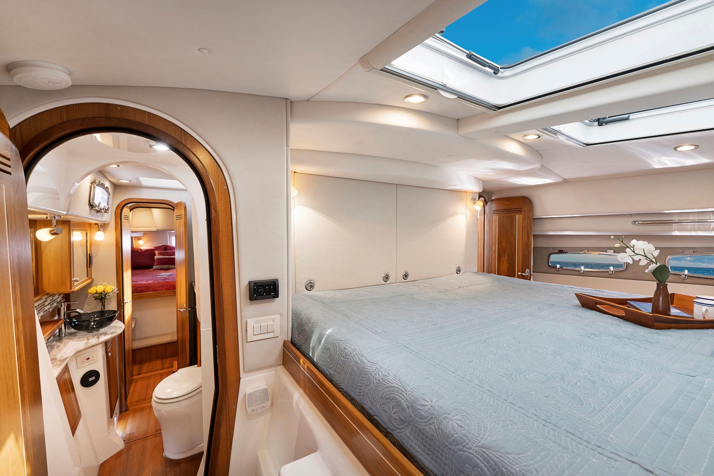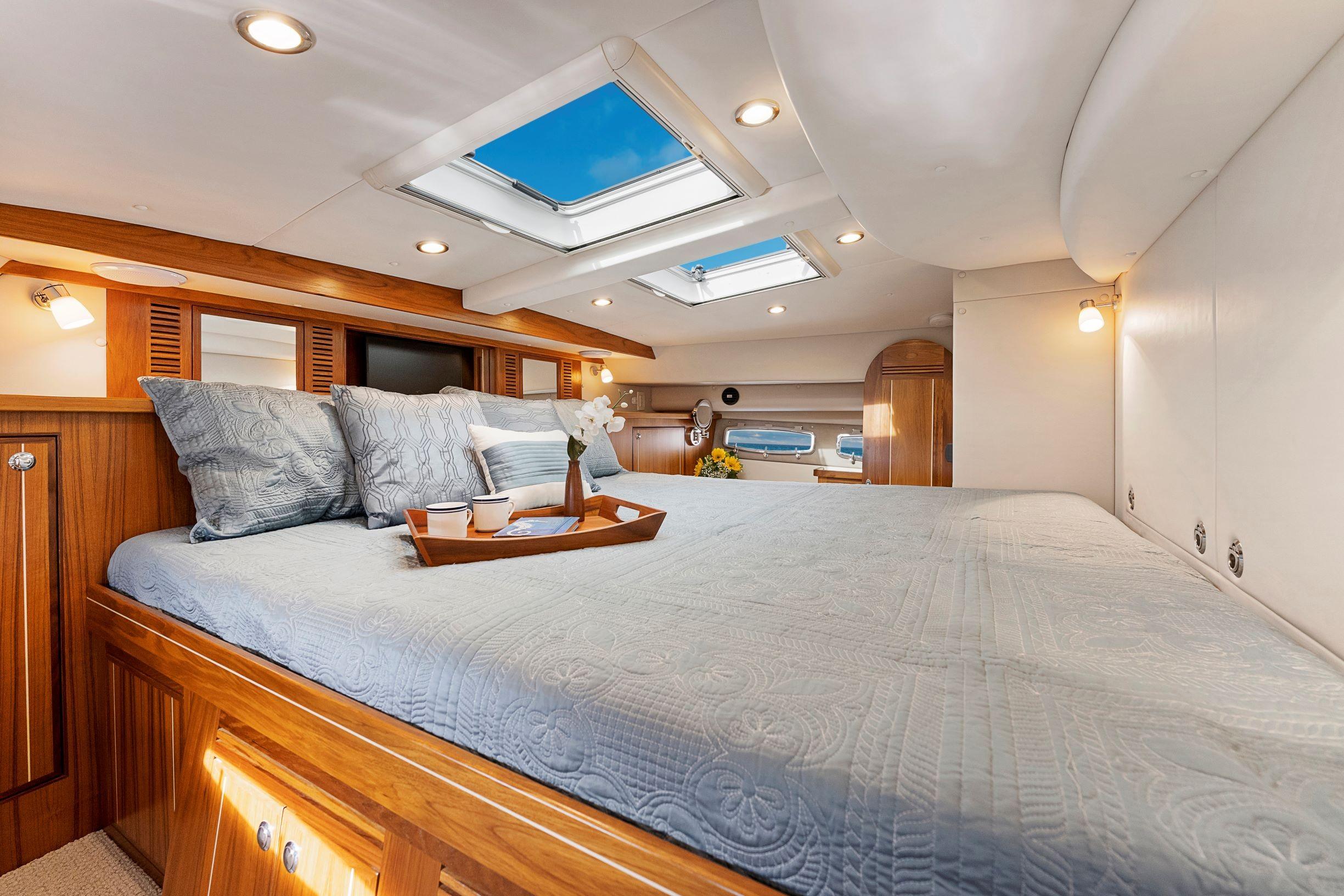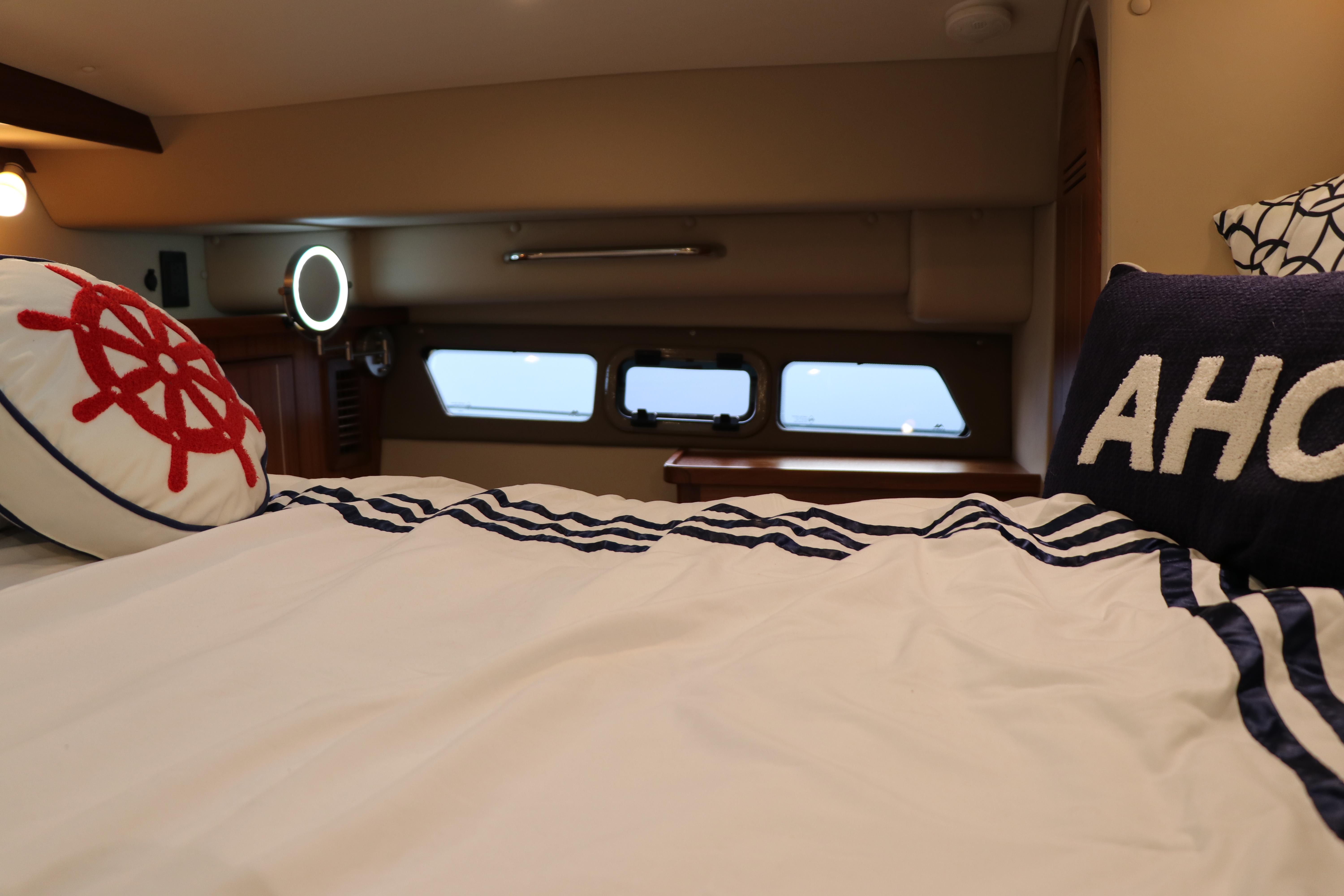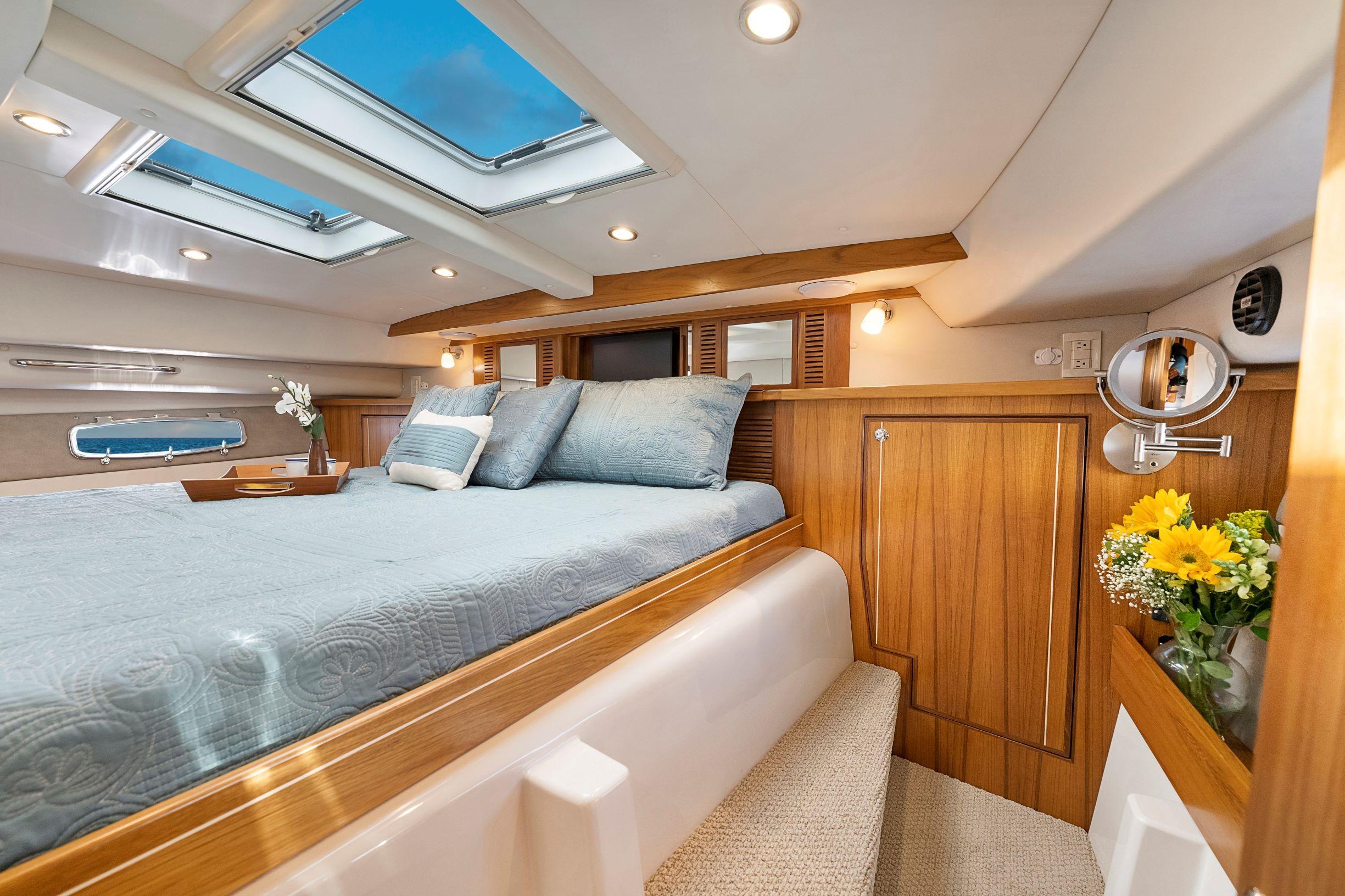 The modern design starts in the salon with an amazing open window layout that brings the grand outdoors right to you. Enjoy Mother Nature in all of her glory with a 360 degree view from every seat! Each hull has a first class head with a shower and large vanity. Below the dinette is a queen size guest stateroom, complete with hanging locker, portlights, and reading lights. Below the galley is a 2nd guest stateroom with a twin bed, portlights, and reading lights. Forward is the absolutely grand, full width, King Island Master stateroom; unheard of in a 40’er. This stateroom includes port & starboard hanging lockers, drawer sets, starboard vanity.