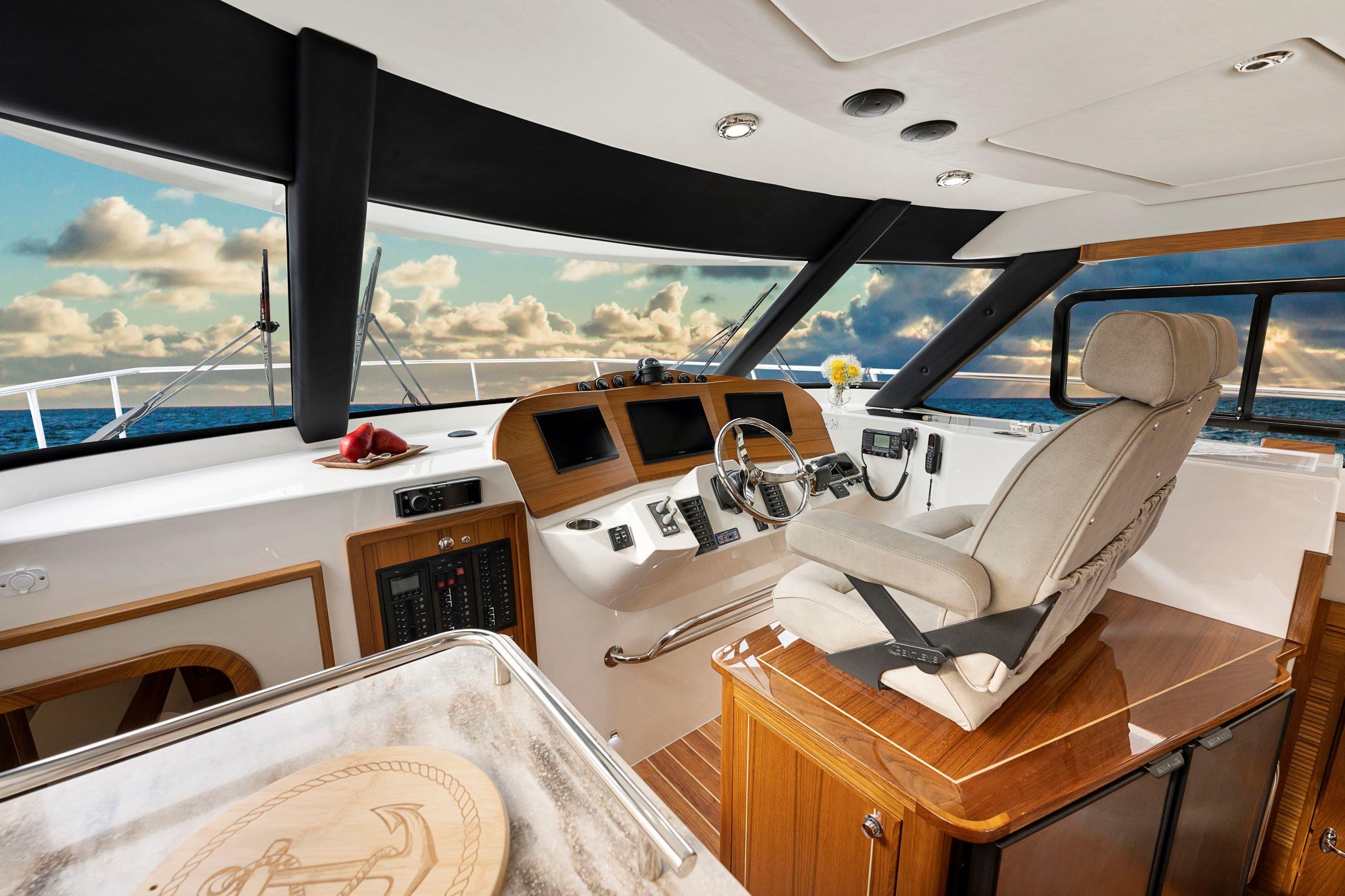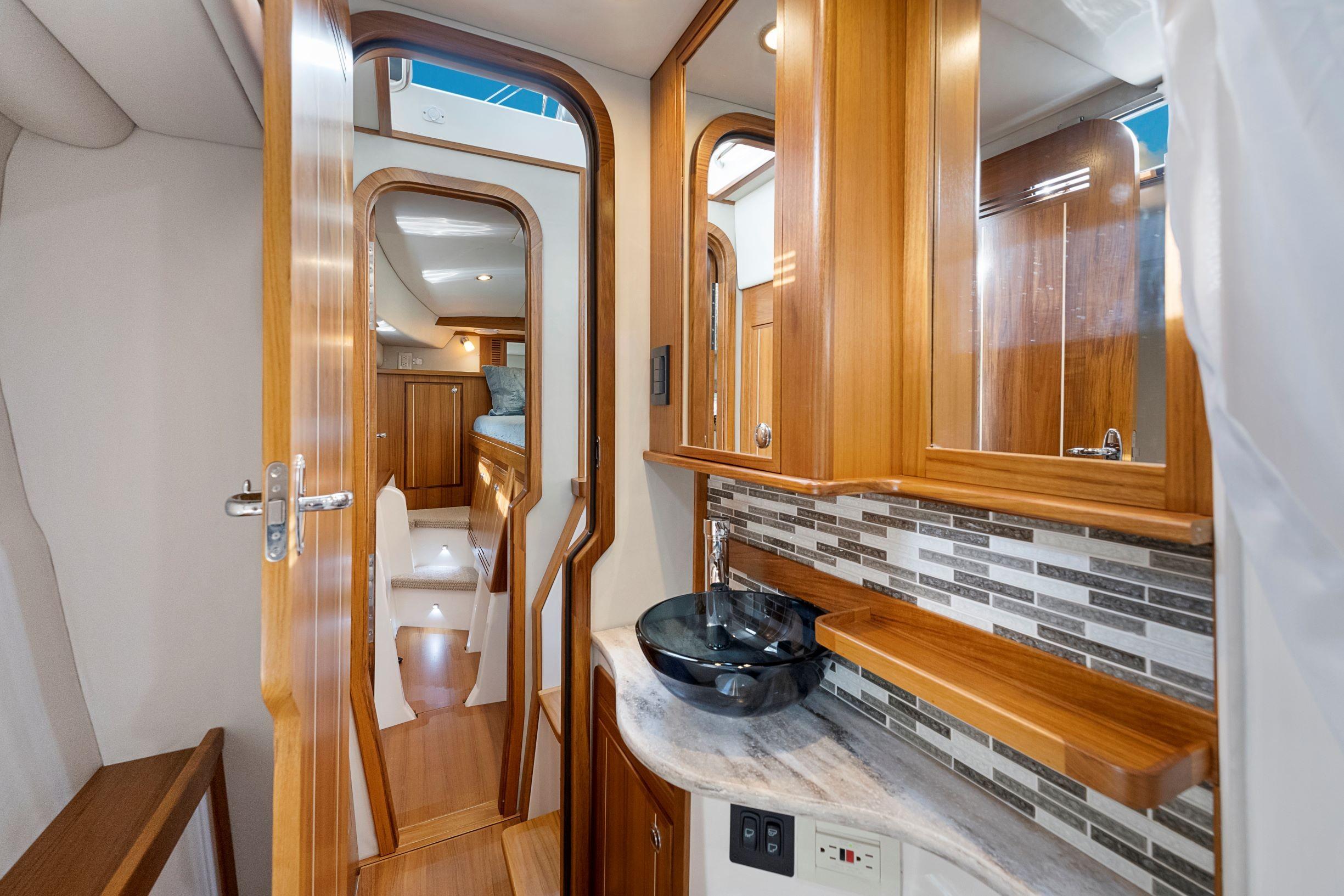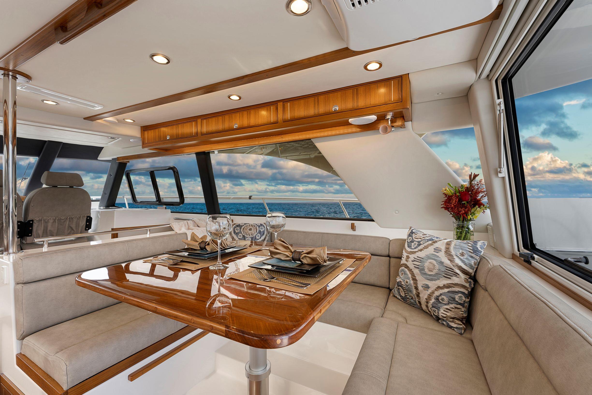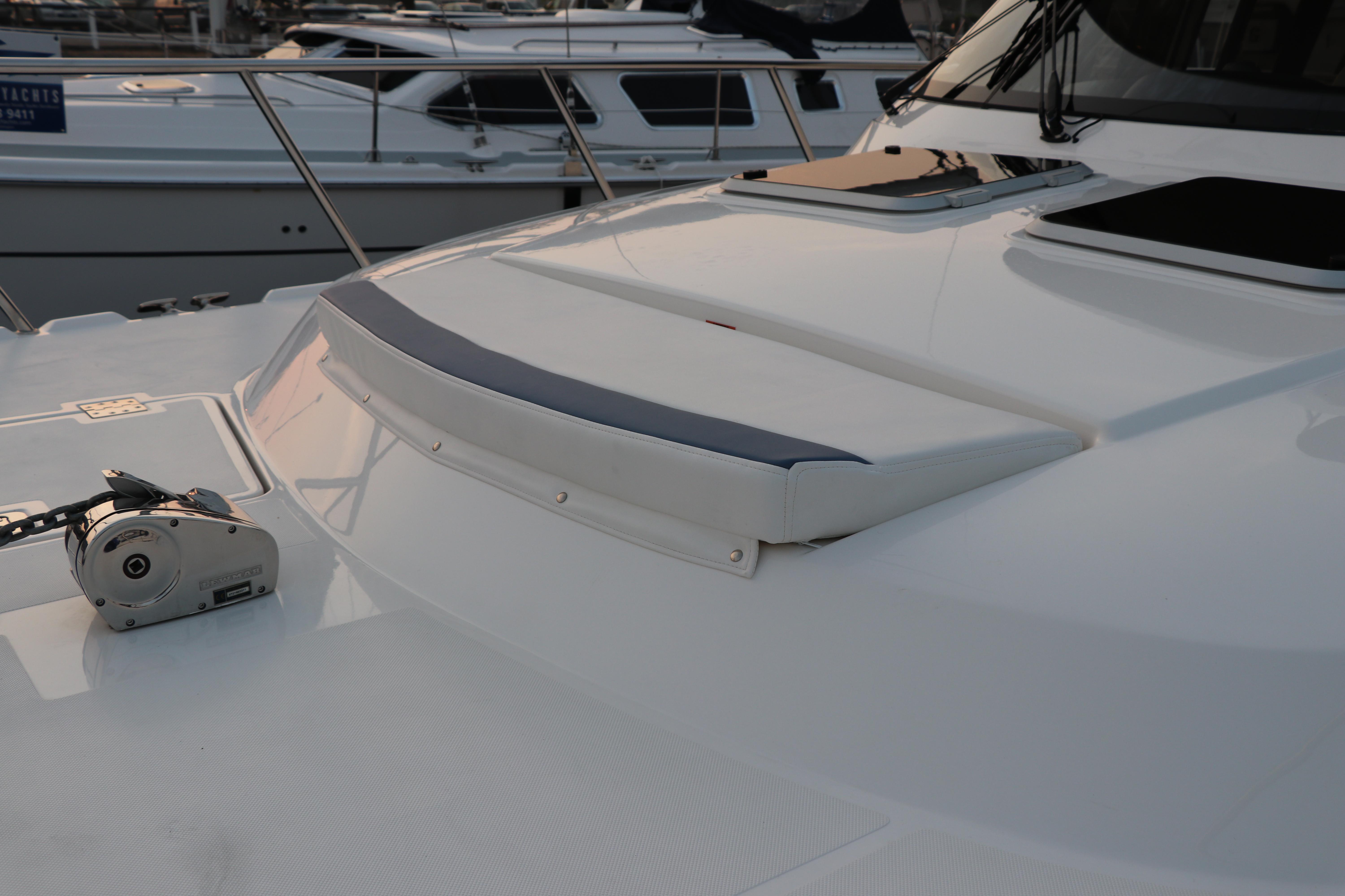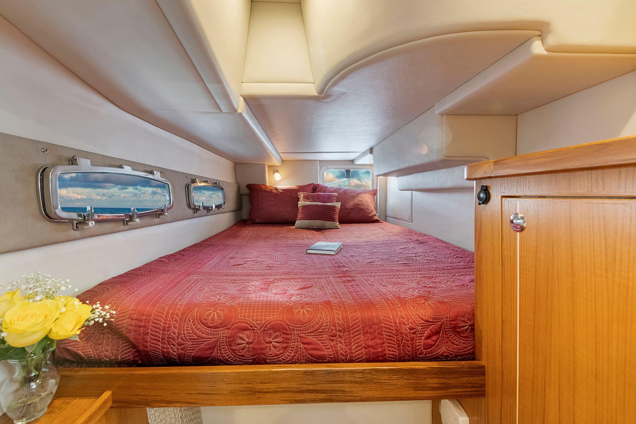 The modern design starts in the salon with an amazing open window layout that brings the grand outdoors right to you. Enjoy Mother Nature in all of her glory with a 360 degree view from every seat! Each hull has a first class head with a shower and large vanity. Below the dinette is a queen size guest stateroom, complete with hanging locker, portlights, and reading lights. Below the galley is a 2nd guest stateroom with a twin bed, portlights, and reading lights. Forward is the absolutely grand, full width, King Island Master stateroom; unheard of in a 40’er. This stateroom includes port & starboard hanging lockers, drawer sets, starboard vanity.