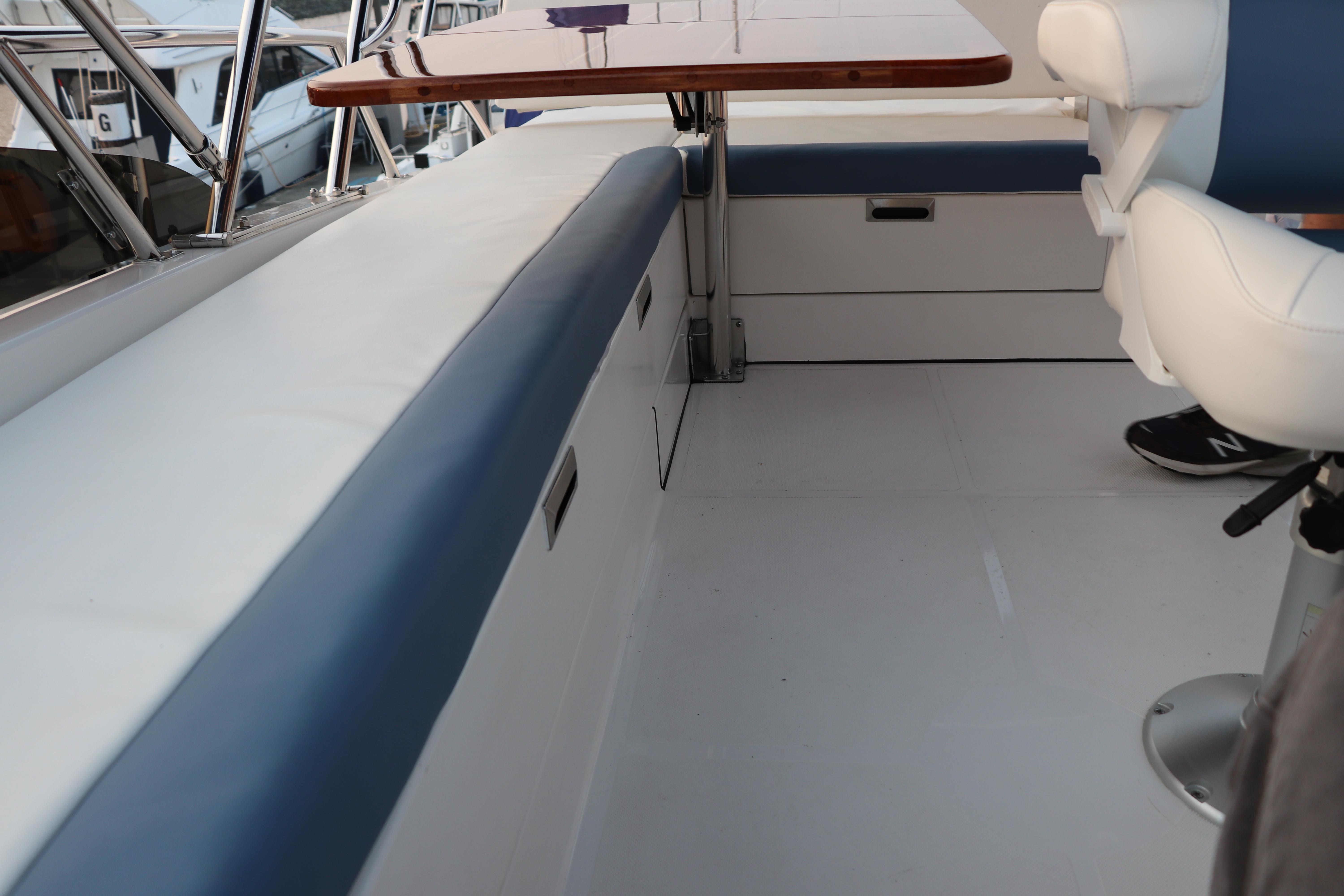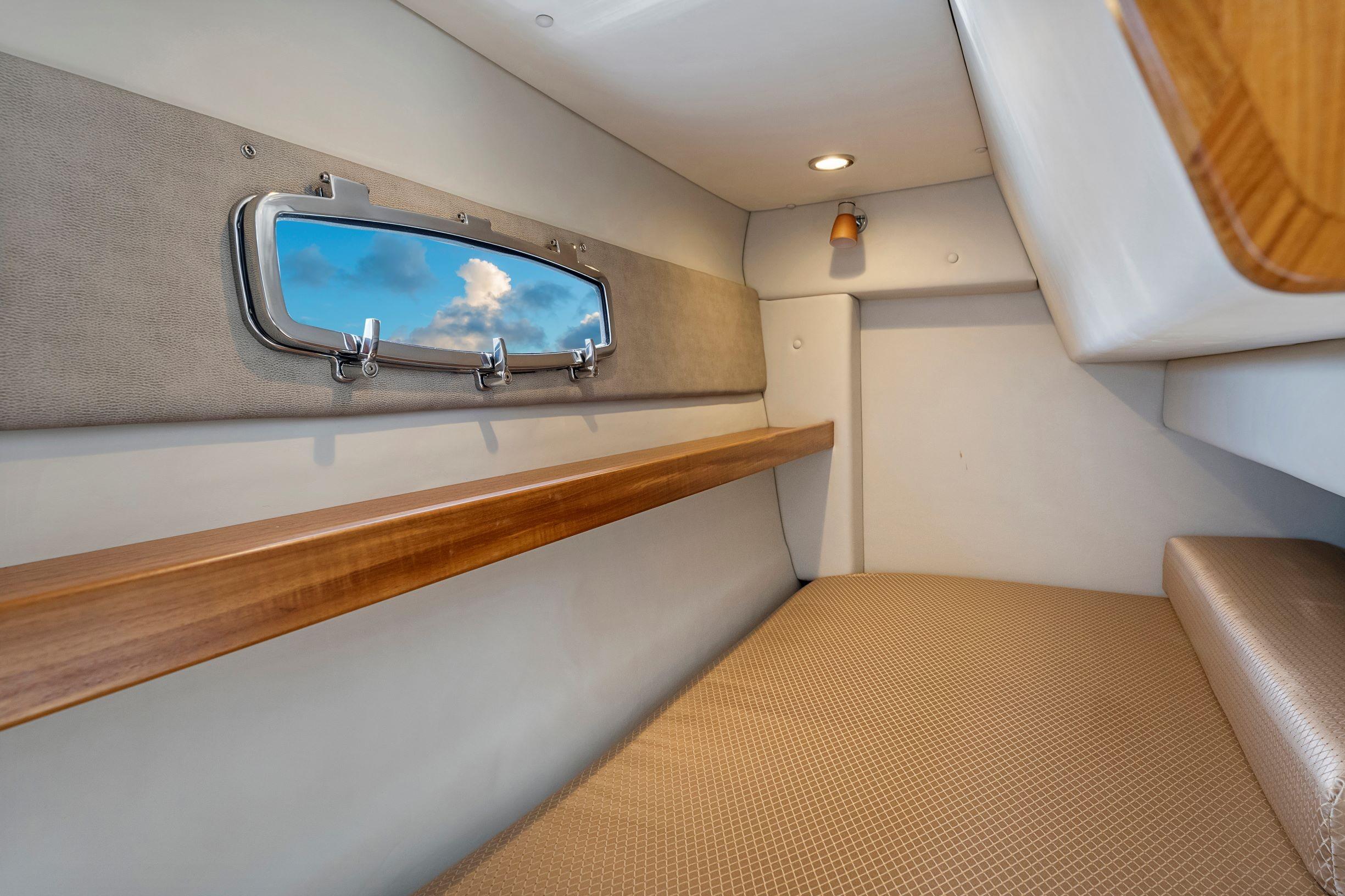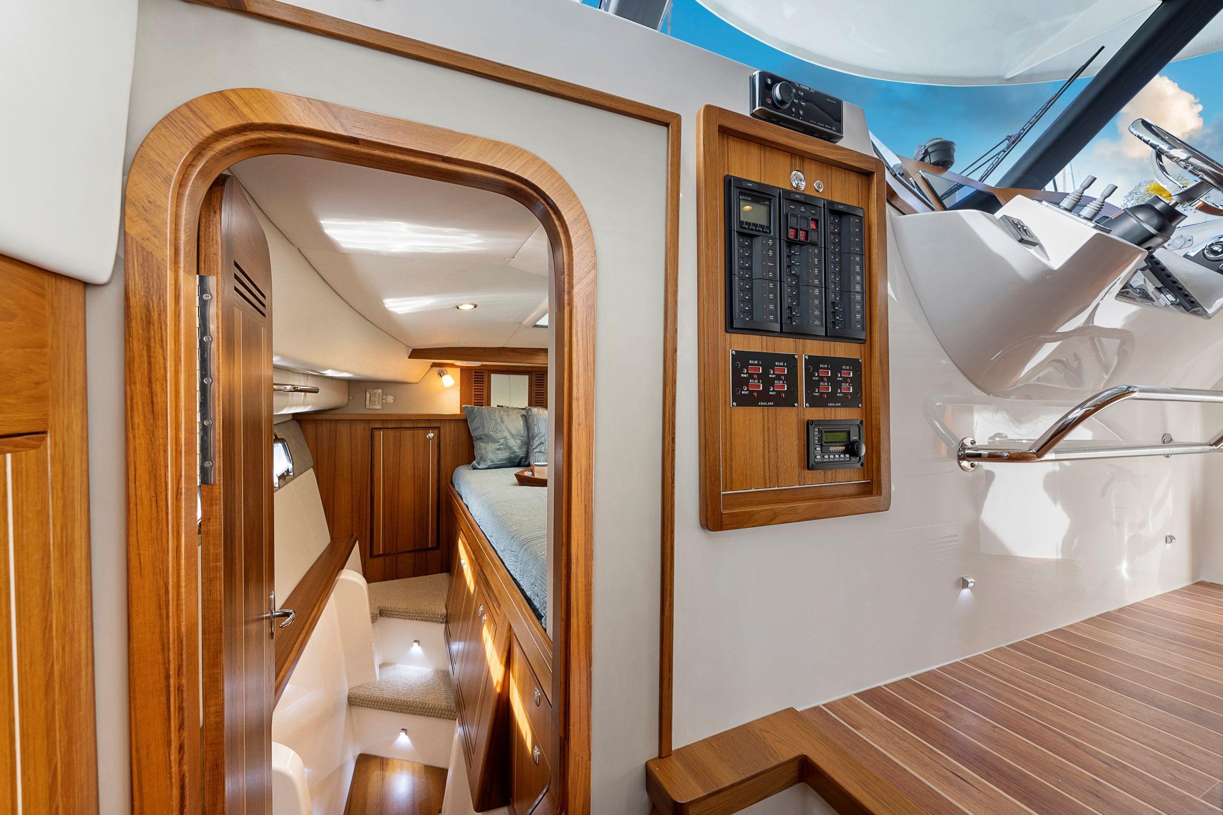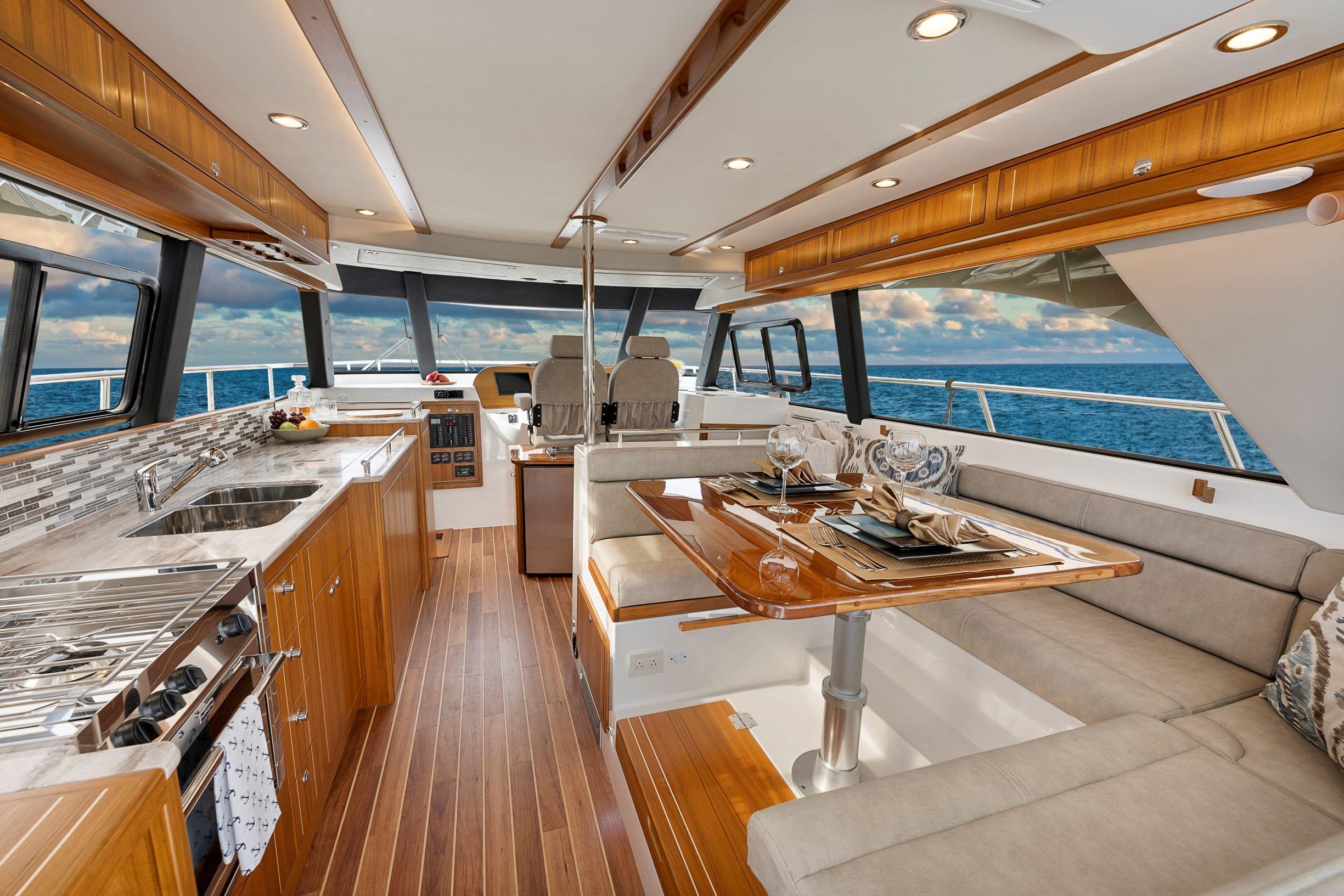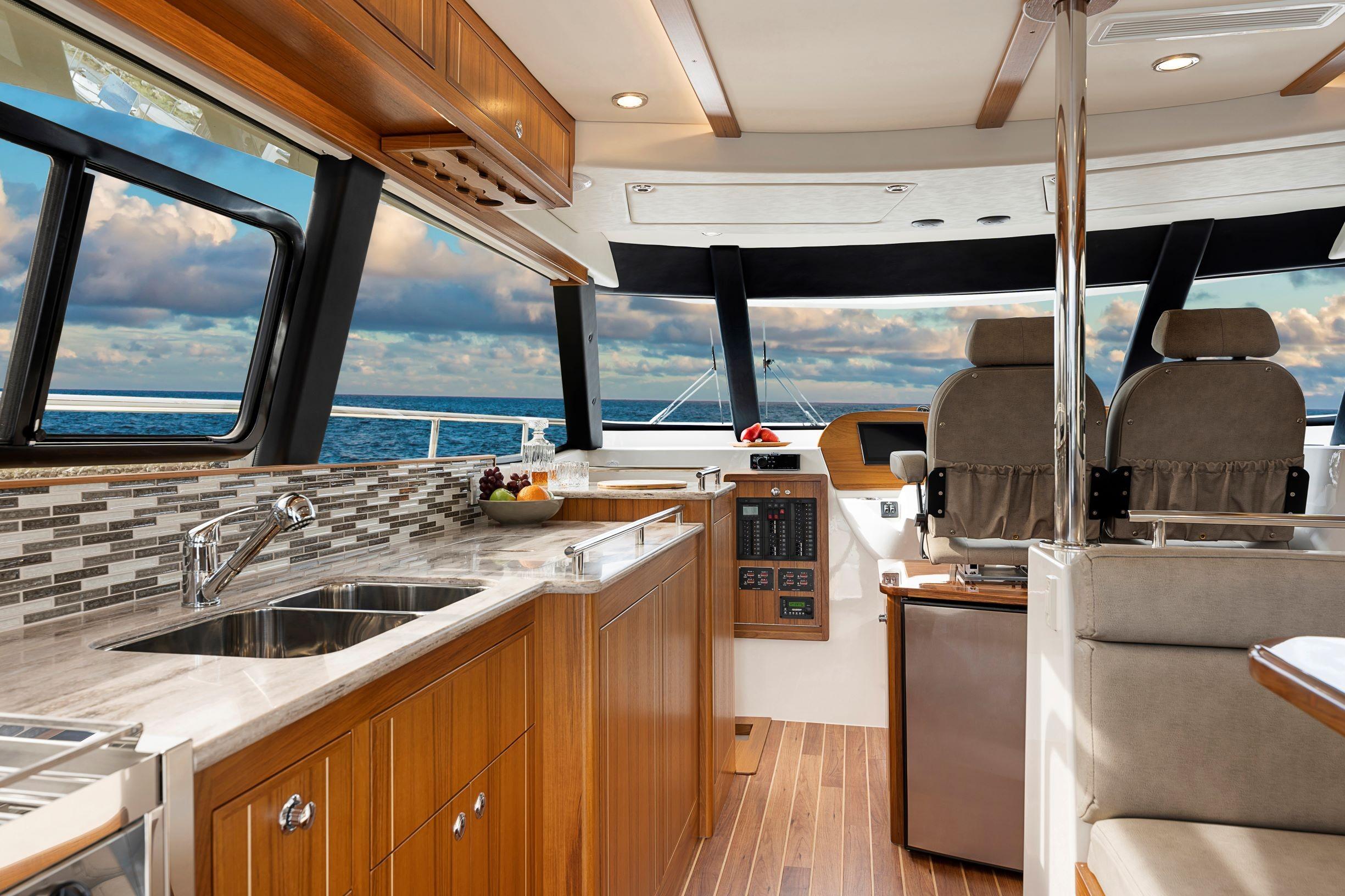 The modern design starts in the salon with an amazing open window layout that brings the grand outdoors right to you. Enjoy Mother Nature in all of her glory with a 360 degree view from every seat! Each hull has a first class head with a shower and large vanity. Below the dinette is a queen size guest stateroom, complete with hanging locker, portlights, and reading lights. Below the galley is a 2nd guest stateroom with a twin bed, portlights, and reading lights. Forward is the absolutely grand, full width, King Island Master stateroom; unheard of in a 40’er. This stateroom includes port & starboard hanging lockers, drawer sets, starboard vanity.