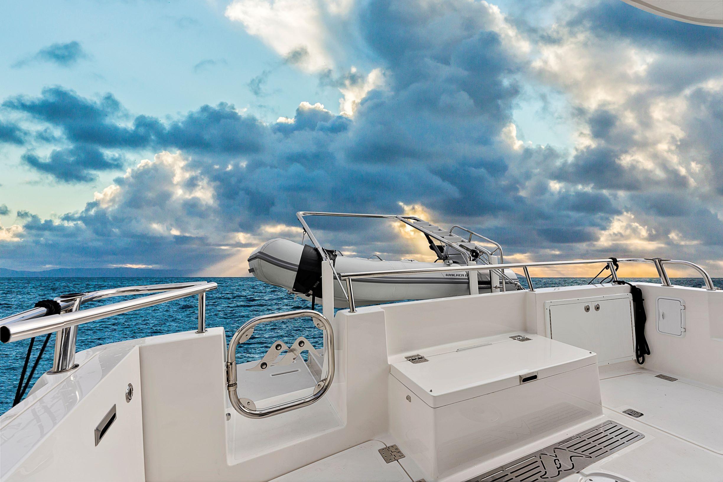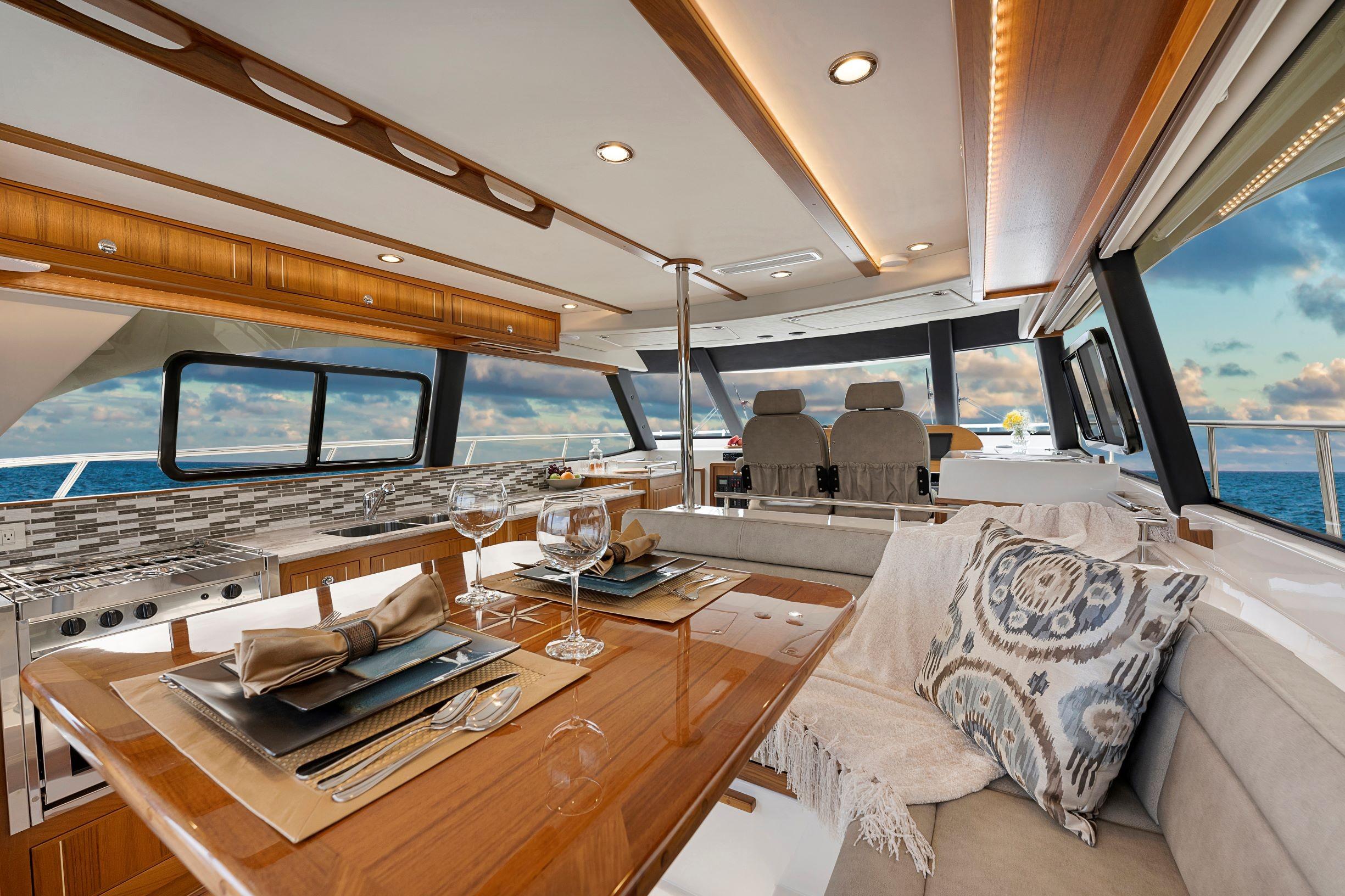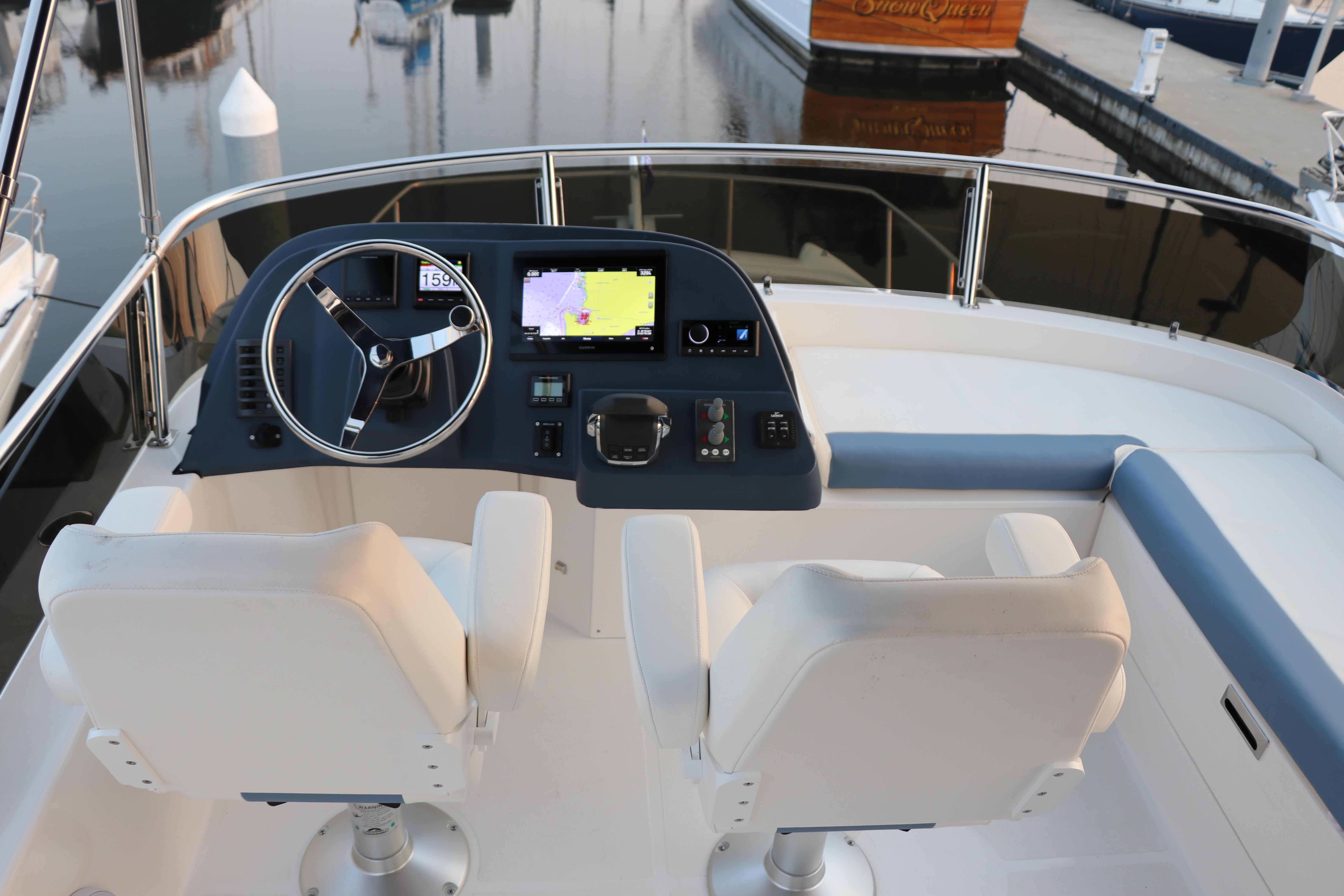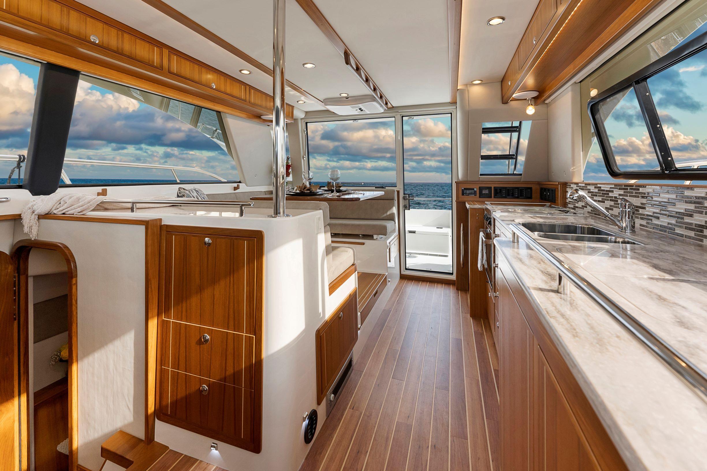 The modern design starts in the salon with an amazing open window layout that brings the grand outdoors right to you. Enjoy Mother Nature in all of her glory with a 360 degree view from every seat! Each hull has a first class head with a shower and large vanity. Below the dinette is a queen size guest stateroom, complete with hanging locker, portlights, and reading lights. Below the galley is a 2nd guest stateroom with a twin bed, portlights, and reading lights. Forward is the absolutely grand, full width, King Island Master stateroom; unheard of in a 40’er. This stateroom includes port & starboard hanging lockers, drawer sets, starboard vanity.